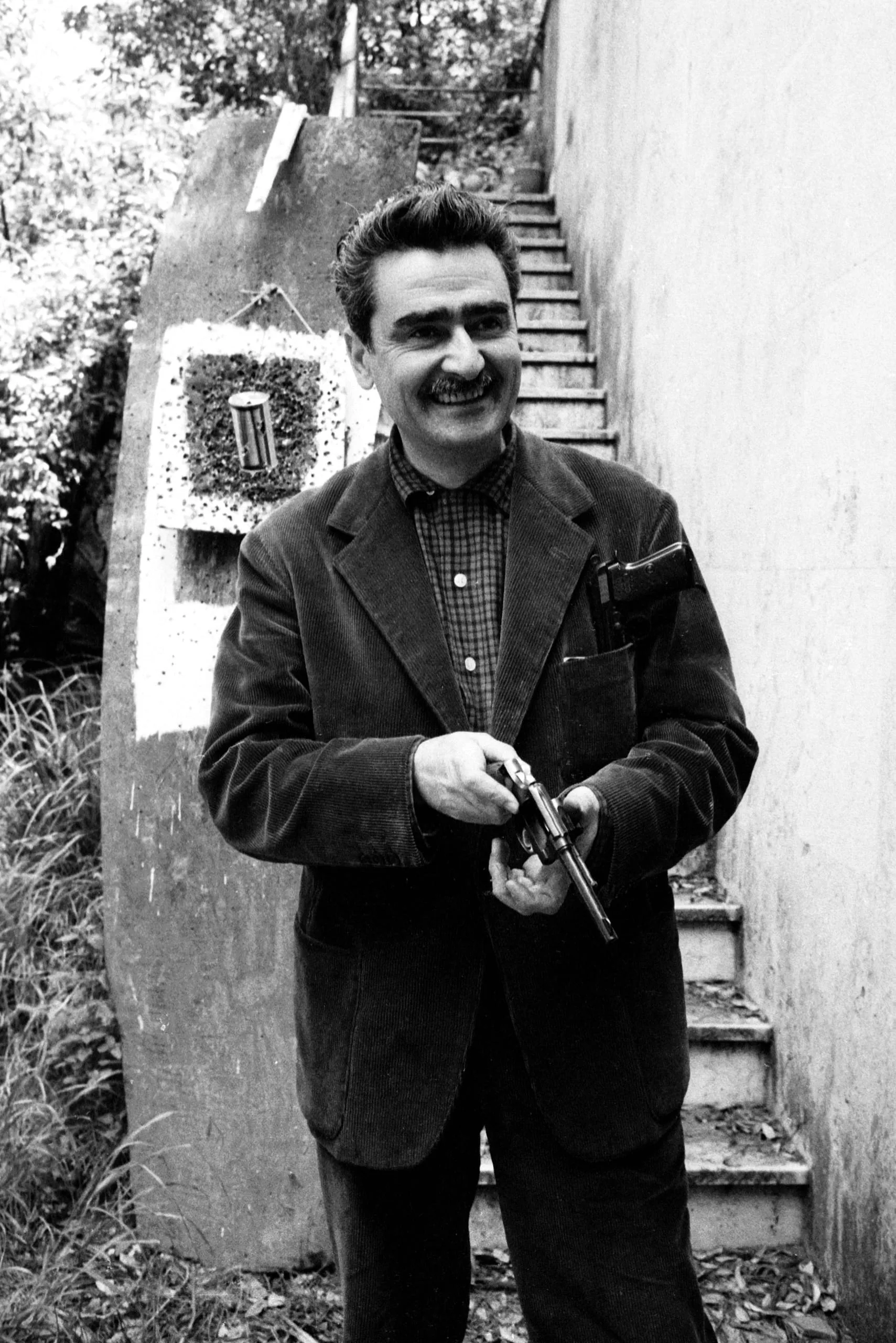 Black and white photograph of a smiling man holding a revolver at waist height, standing before a concrete shooting target outdoors, with stairs visible behind him