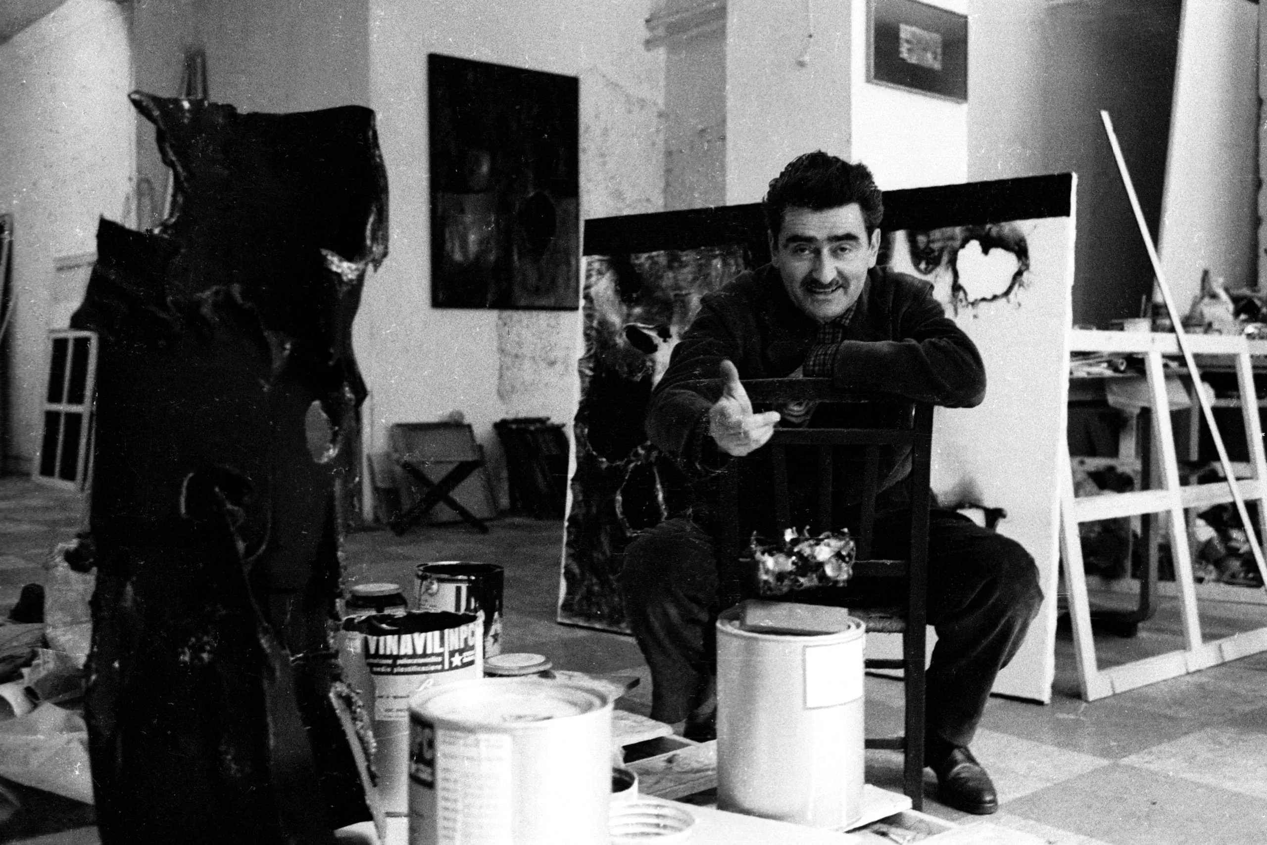 Black and white photograph of a man seated in an artist's studio, smiling and holding a palette knife, surrounded by paint cans, dark sculptures, and large abstract canvases