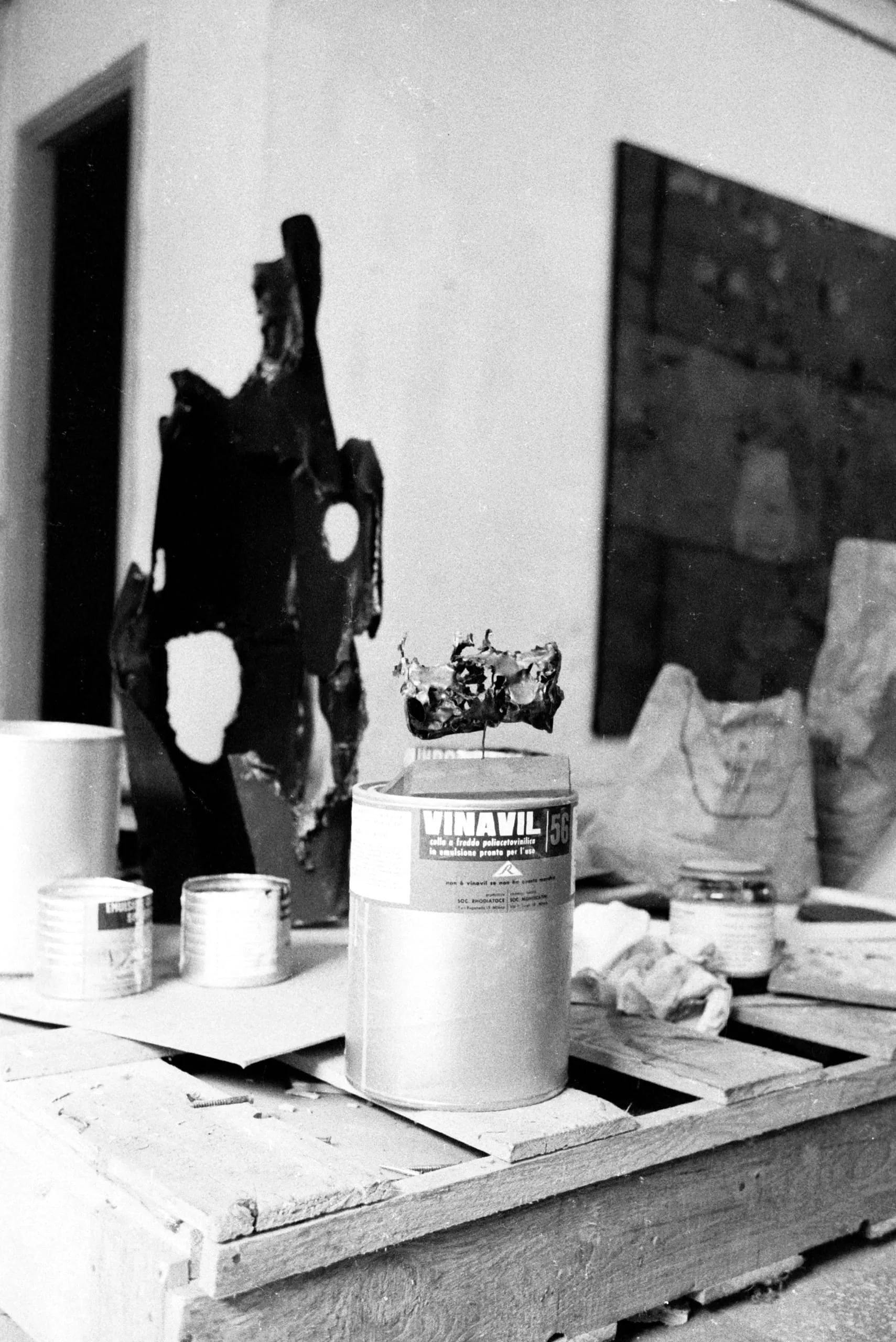 Black and white photograph of an artist's studio worktable with a VINAVIL 56 can, small paint tins, and a large abstract sculpture visible in the background