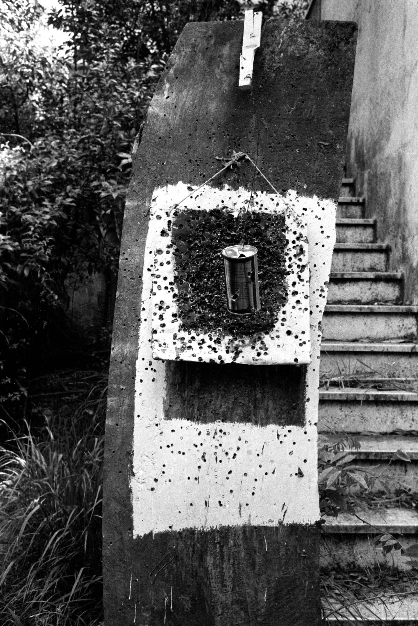 Black and white photograph of a weathered concrete slab outdoors, with a white panel mounted to its face holding a moss-covered metal cylinder and a pitted lower ledge