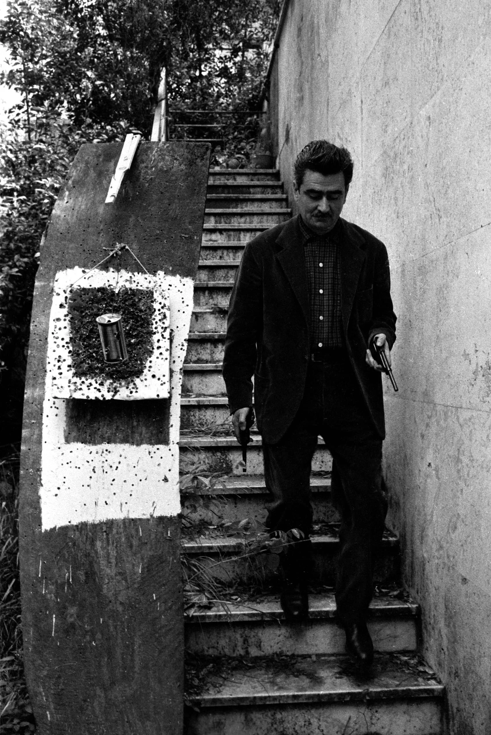 Black and white photograph of a man in a dark jacket descending concrete stairs, holding two handguns, beside a weathered wall with a bullet-riddled painted target