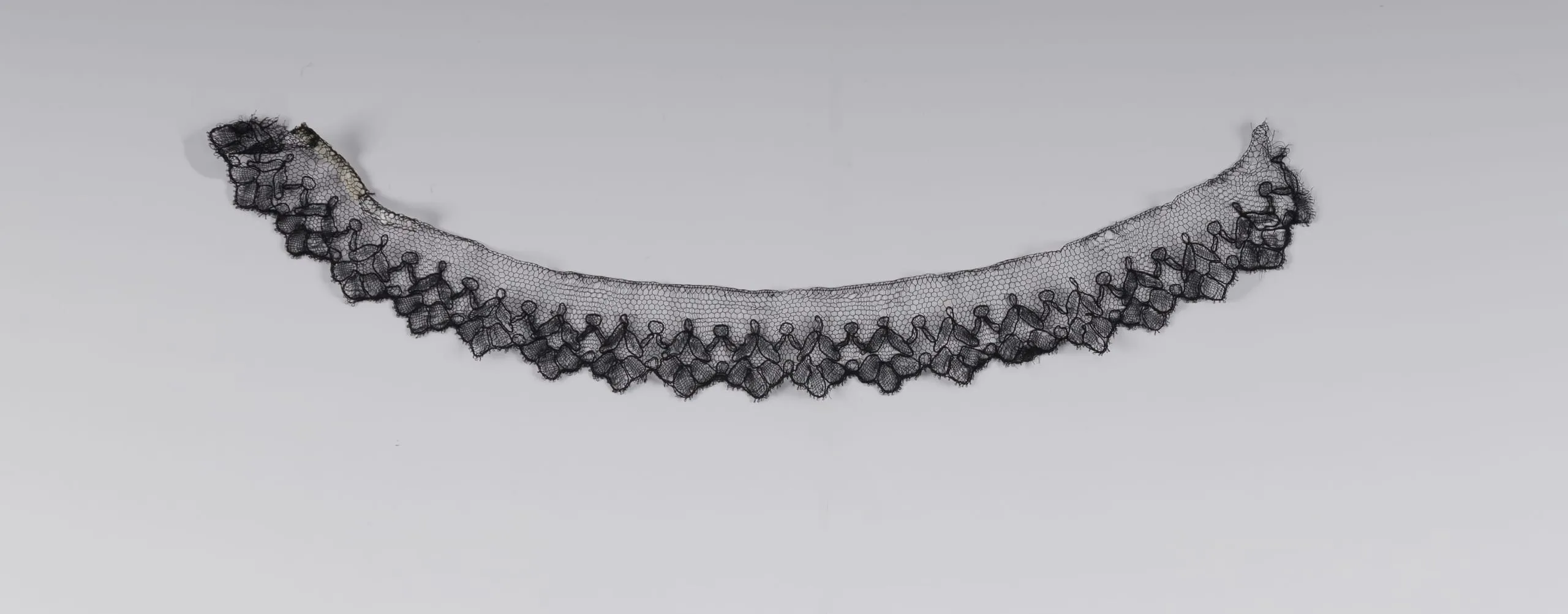 Fragment of black lace in a curved strip, with open mesh ground and geometric zigzag borders along both edges, displayed flat against a gray background