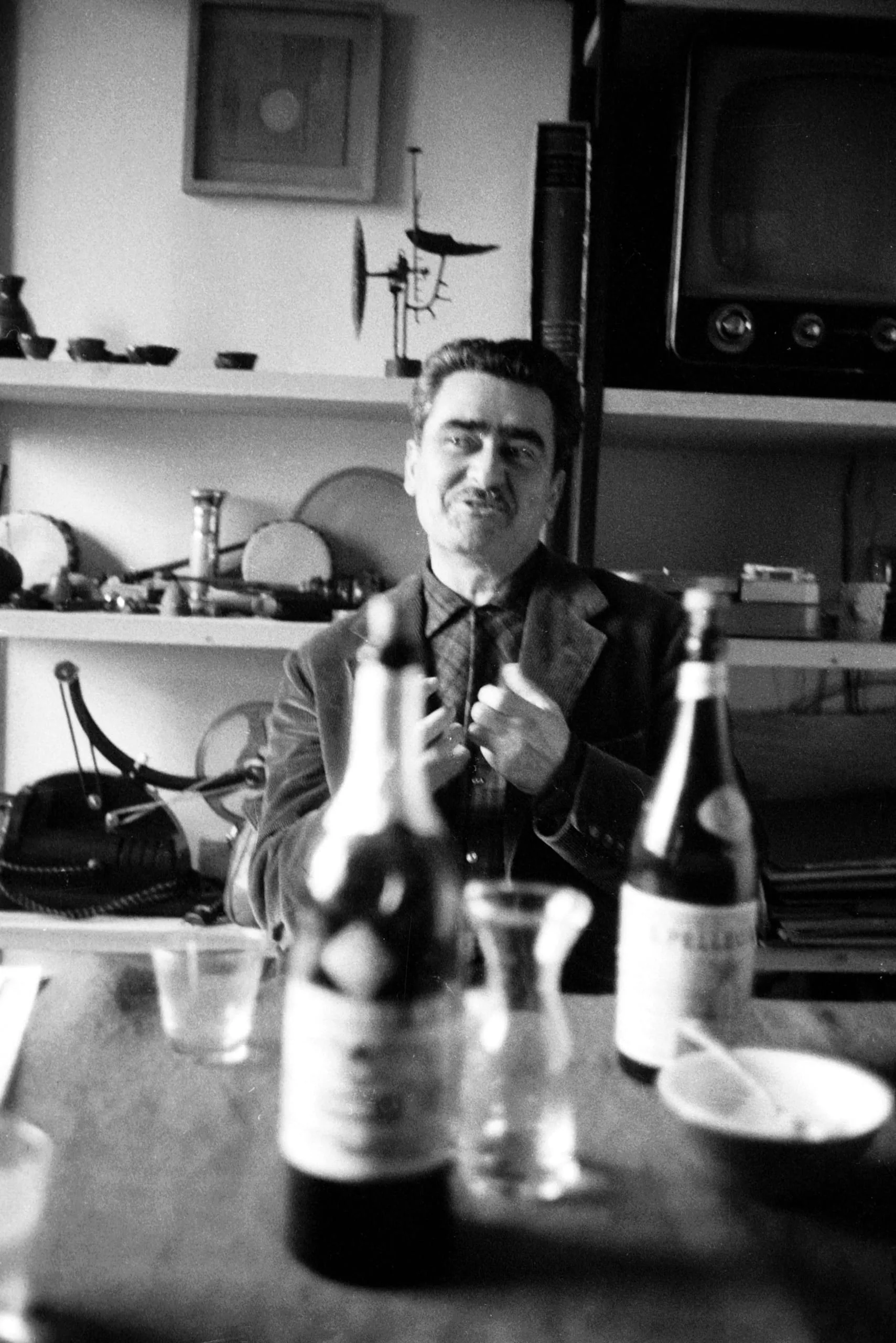 Black and white photograph of a mustachioed man seated at a table mid-conversation, with out-of-focus bottles in the foreground and cluttered shelving and a television behind him