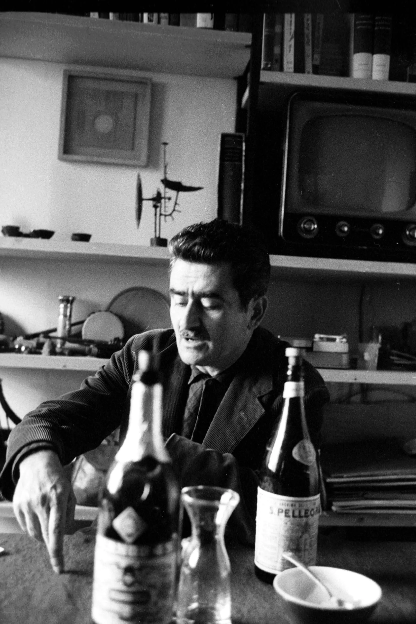 Black and white photograph of a dark-haired man with a mustache seated at a table, leaning toward bottles in the foreground, cluttered shelves and a vintage television visible behind him