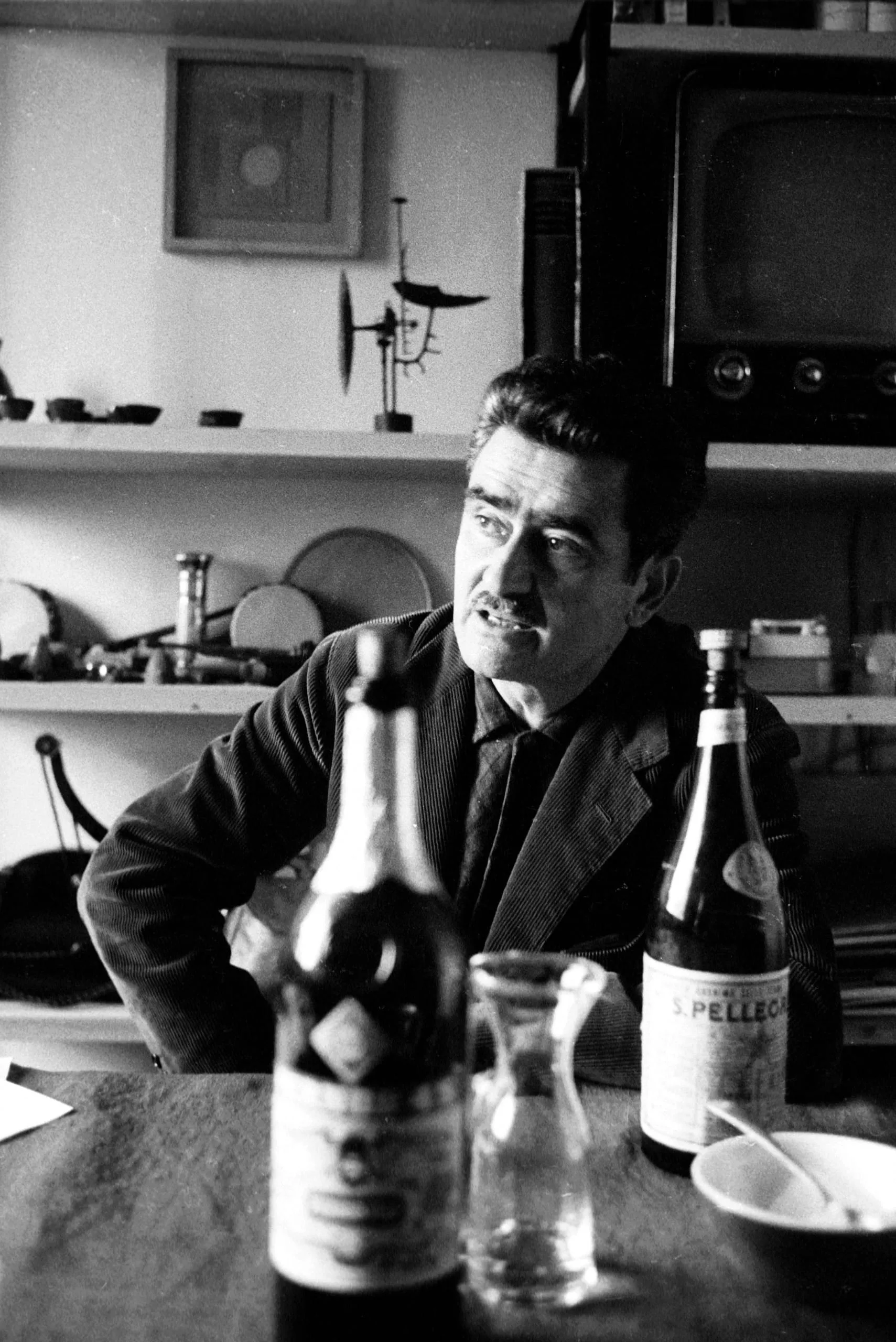 Black and white photograph of a dark-haired man with a mustache seated at a table with glass bottles, looking up and to the right, cluttered shelves and a vintage television visible behind him