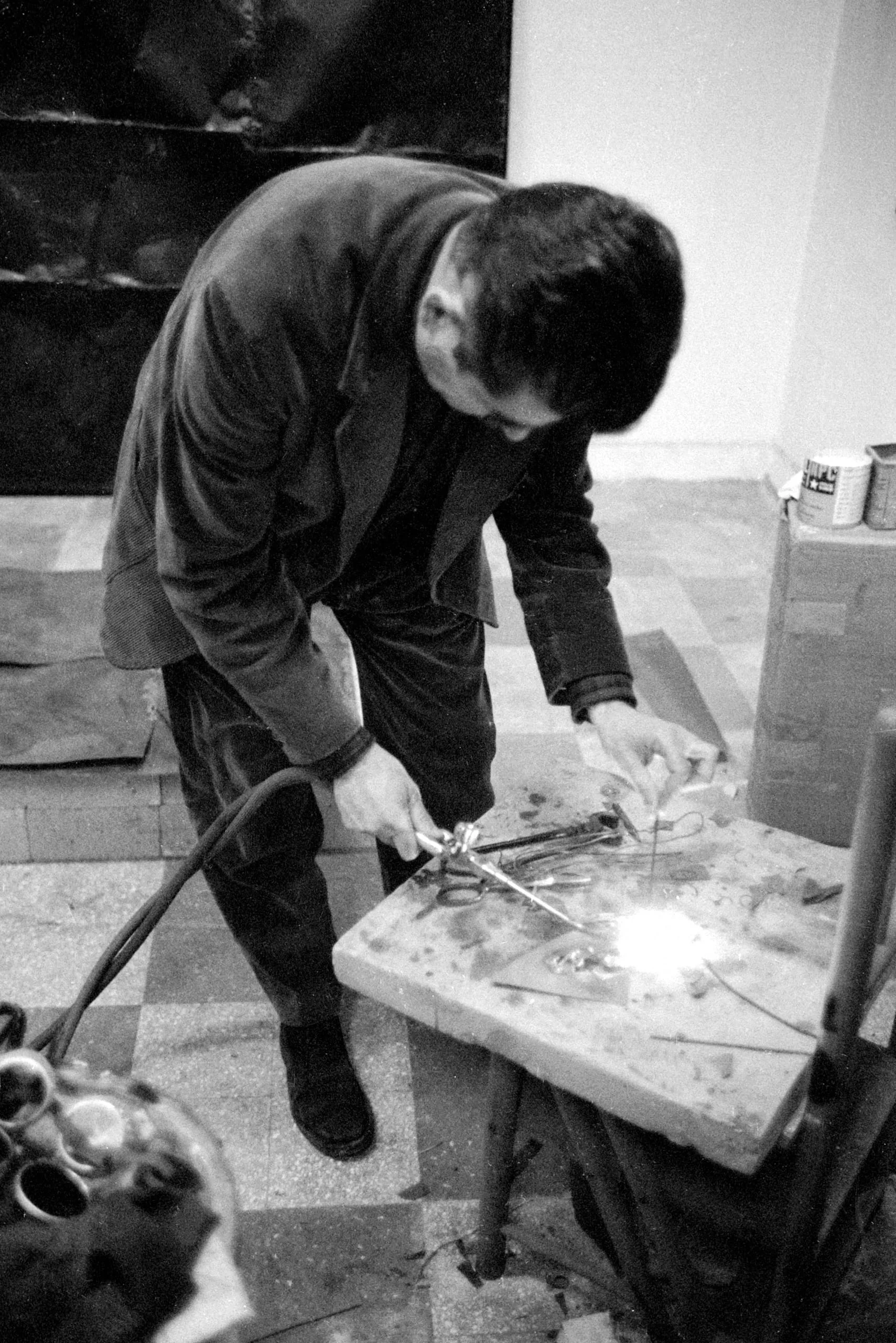 Black and white photograph of a man in dark jacket bending over a paint-splattered worktable, using a welding or soldering torch with a bright flare at the work point