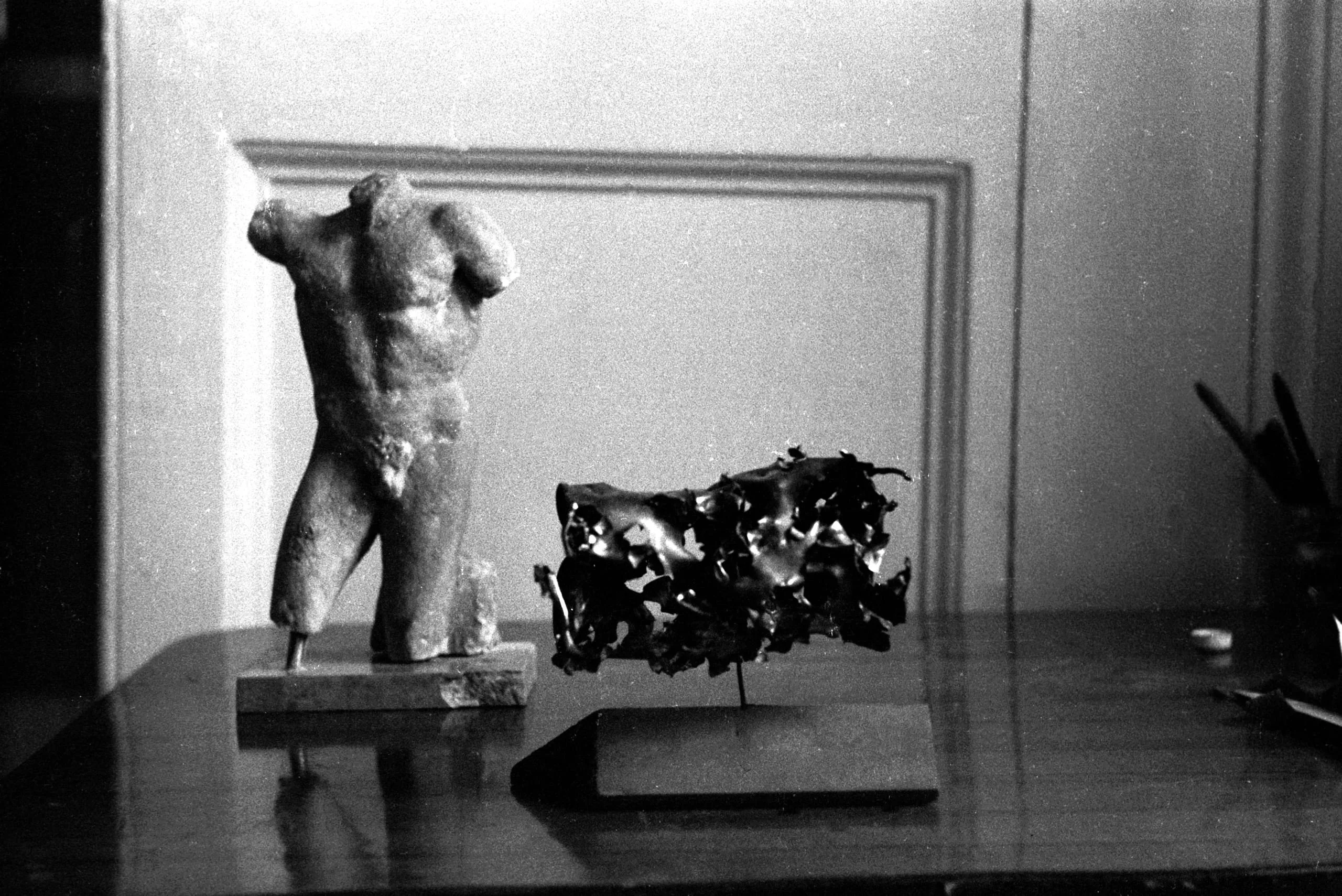 Black and white photograph of two small sculptures on a wooden table: a headless classical male torso on a base and an abstract jagged metal form
