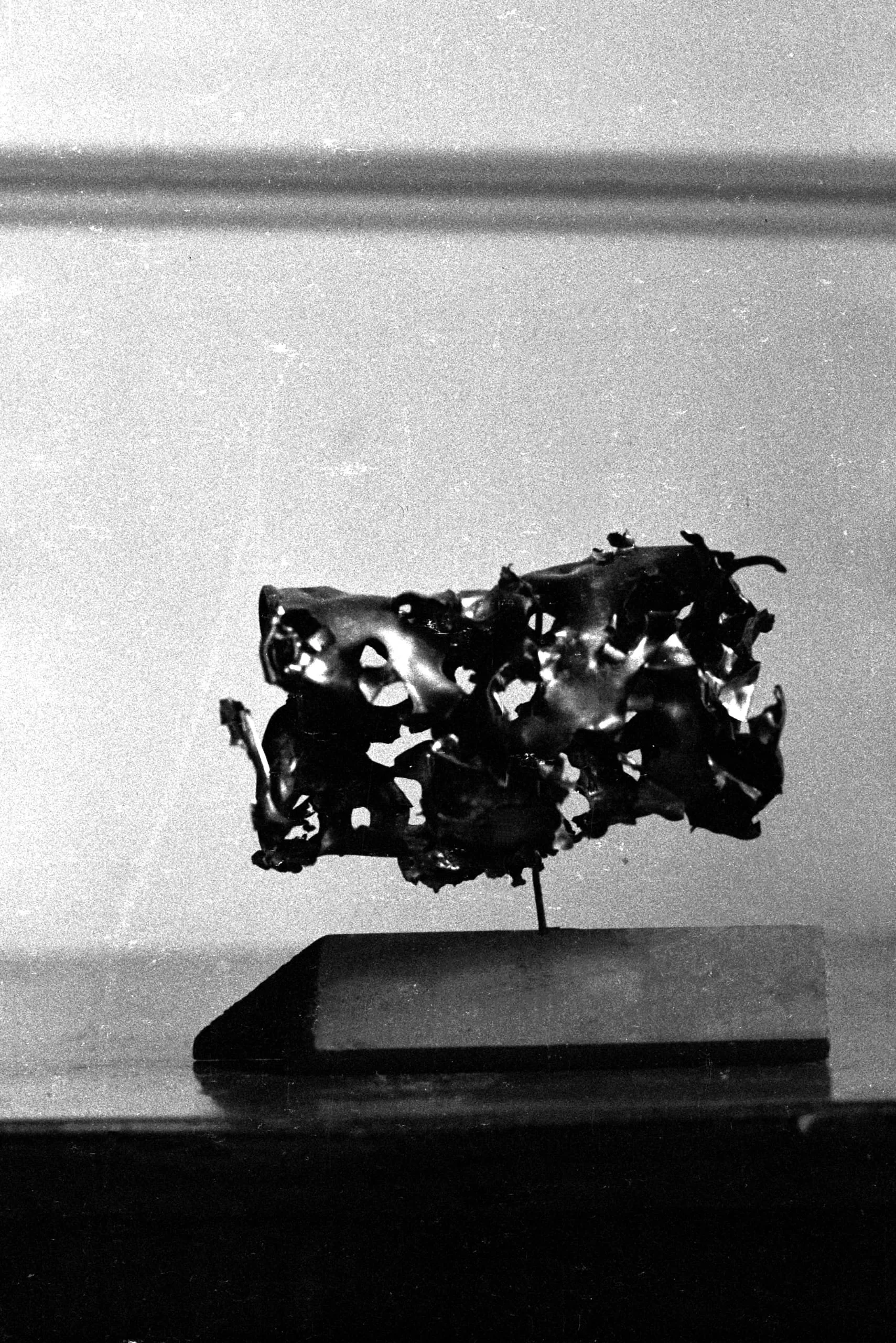 Black and white photograph of a small abstract metal sculpture with jagged, perforated form, mounted on a thin rod above a rectangular pedestal