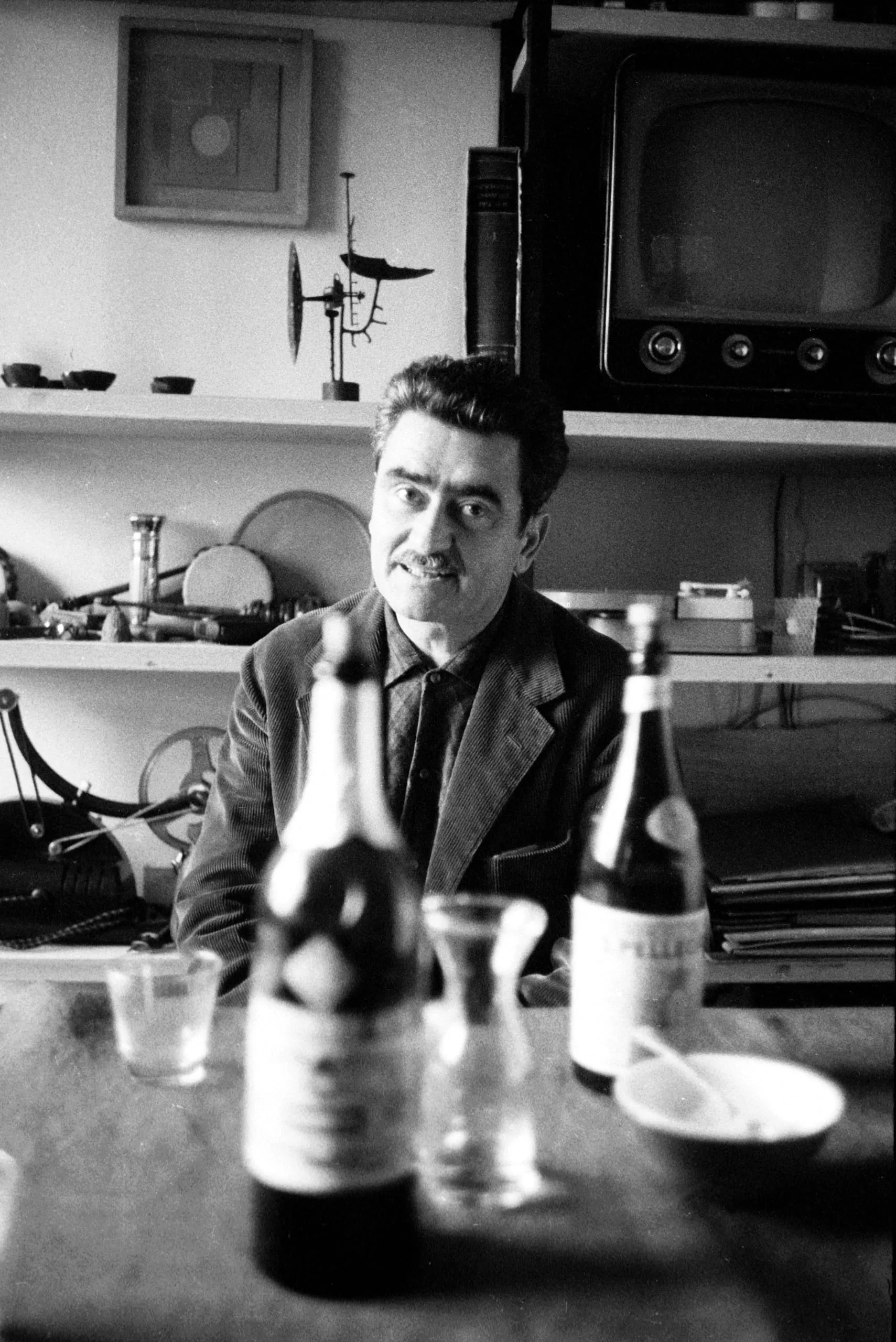 Black and white photograph of a white man in a dark blazer seated at a table with bottles in the foreground, shelves and a vintage television visible behind him
