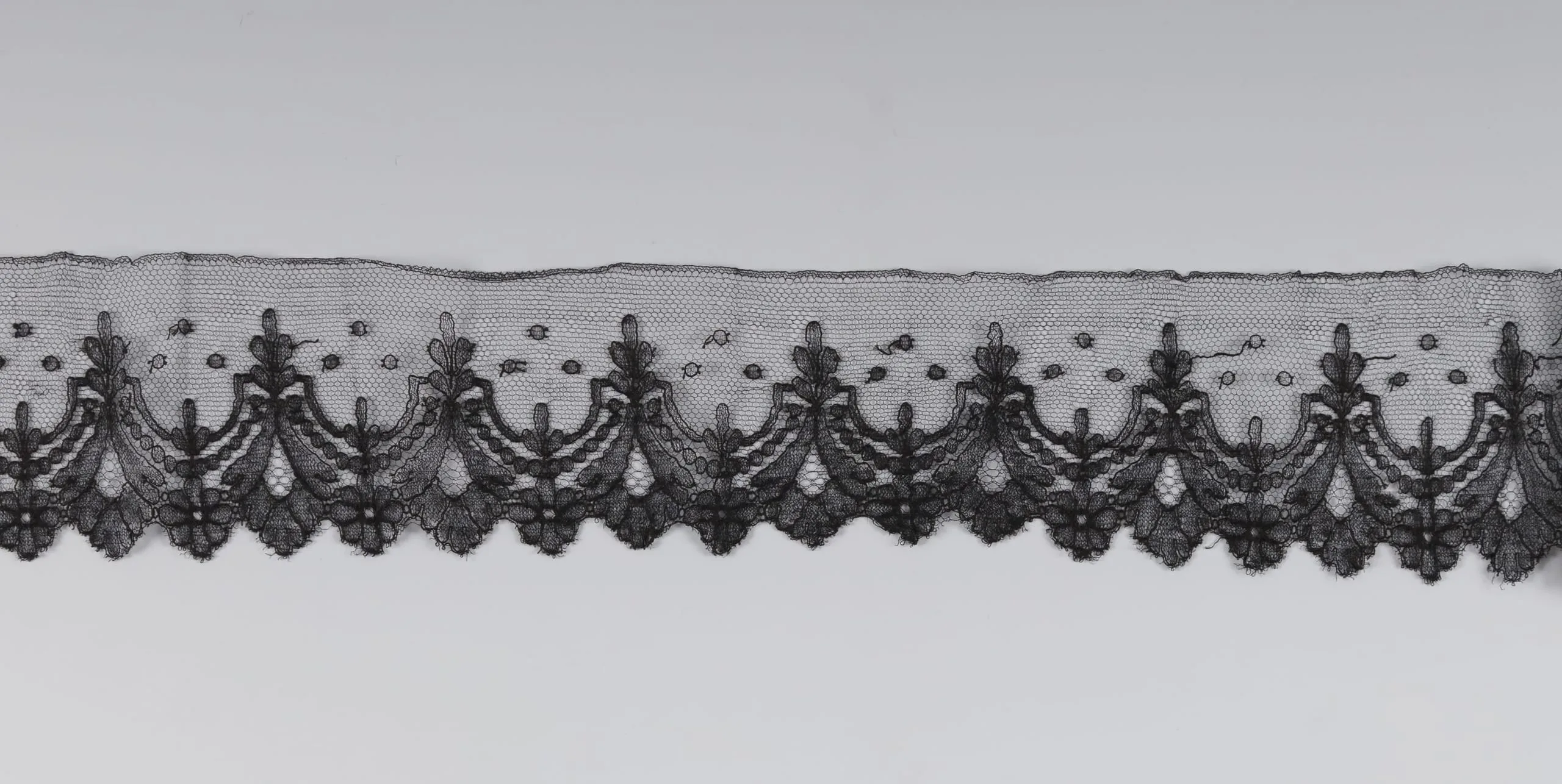Strip of black needle or bobbin lace with a scalloped lower edge, repeating arch-and-swag pattern, and scattered dot motifs on a sheer net ground