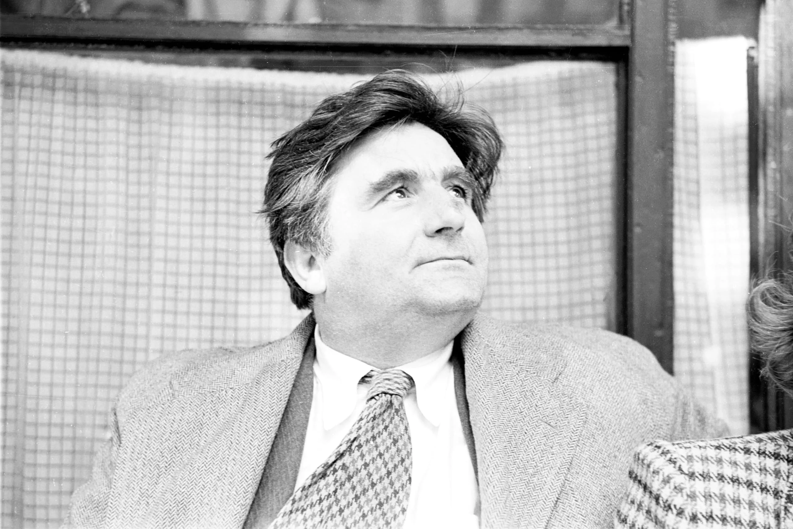 Black and white photograph, man from the chest up, head tilted back, looking upward, wearing a tweed jacket and patterned tie, seated near a gridded window