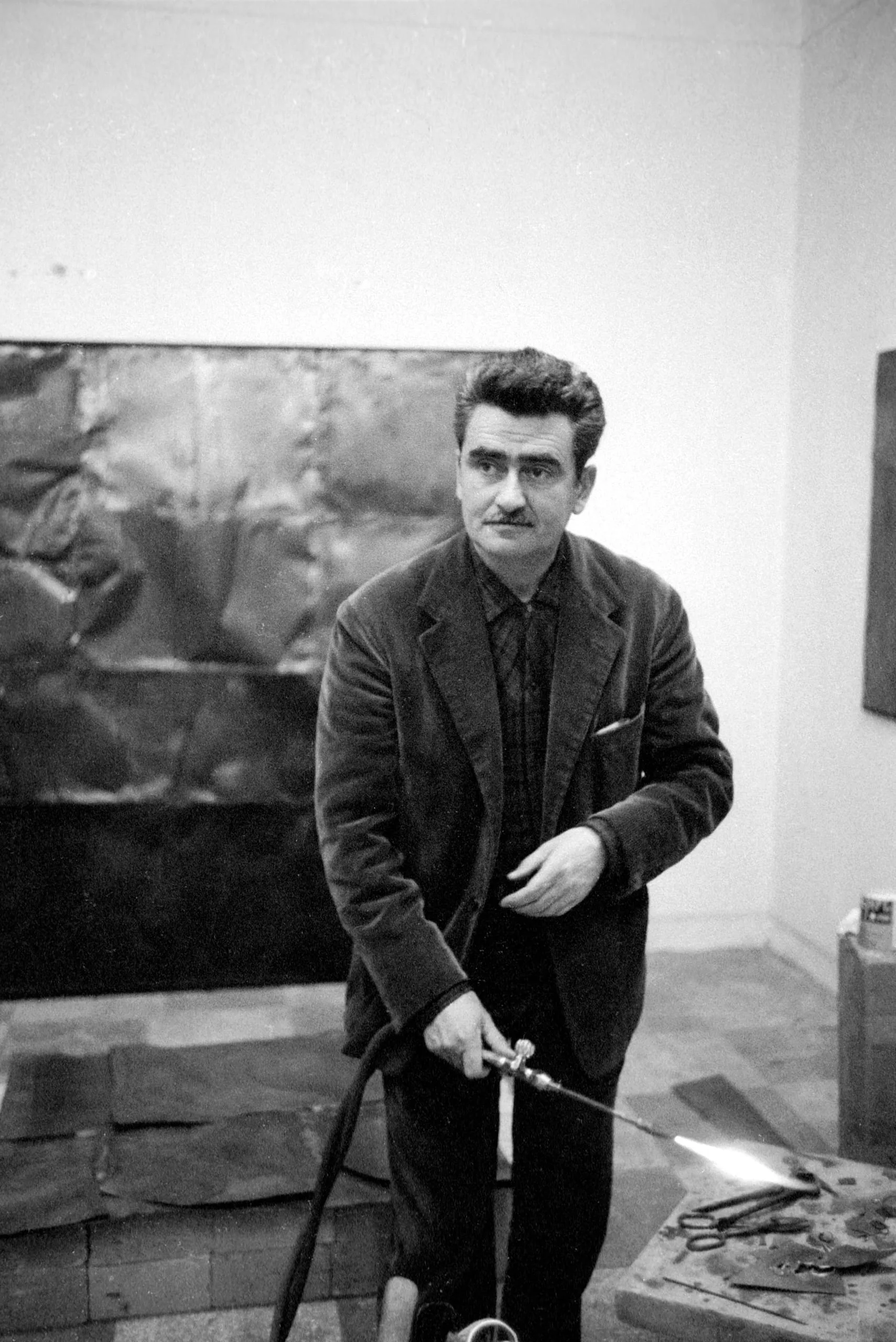 Black and white photograph of a man in a sport coat holding a torch nozzle and hose, standing before a large textured metal artwork on a white gallery wall