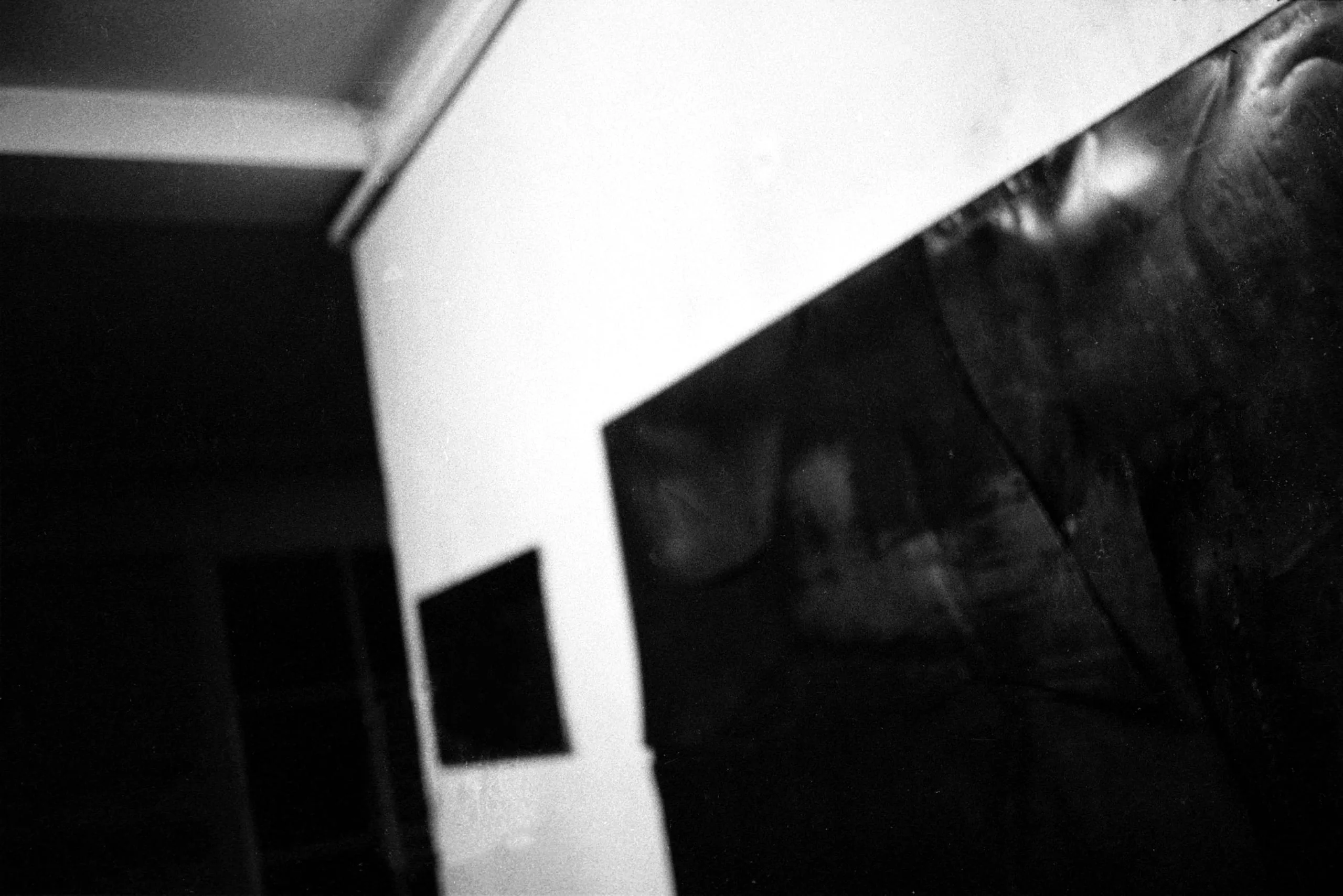 Black and white photograph of a room interior shot at a tilted angle, with a large dark glossy sheet hanging on a white wall, heavily out of focus throughout