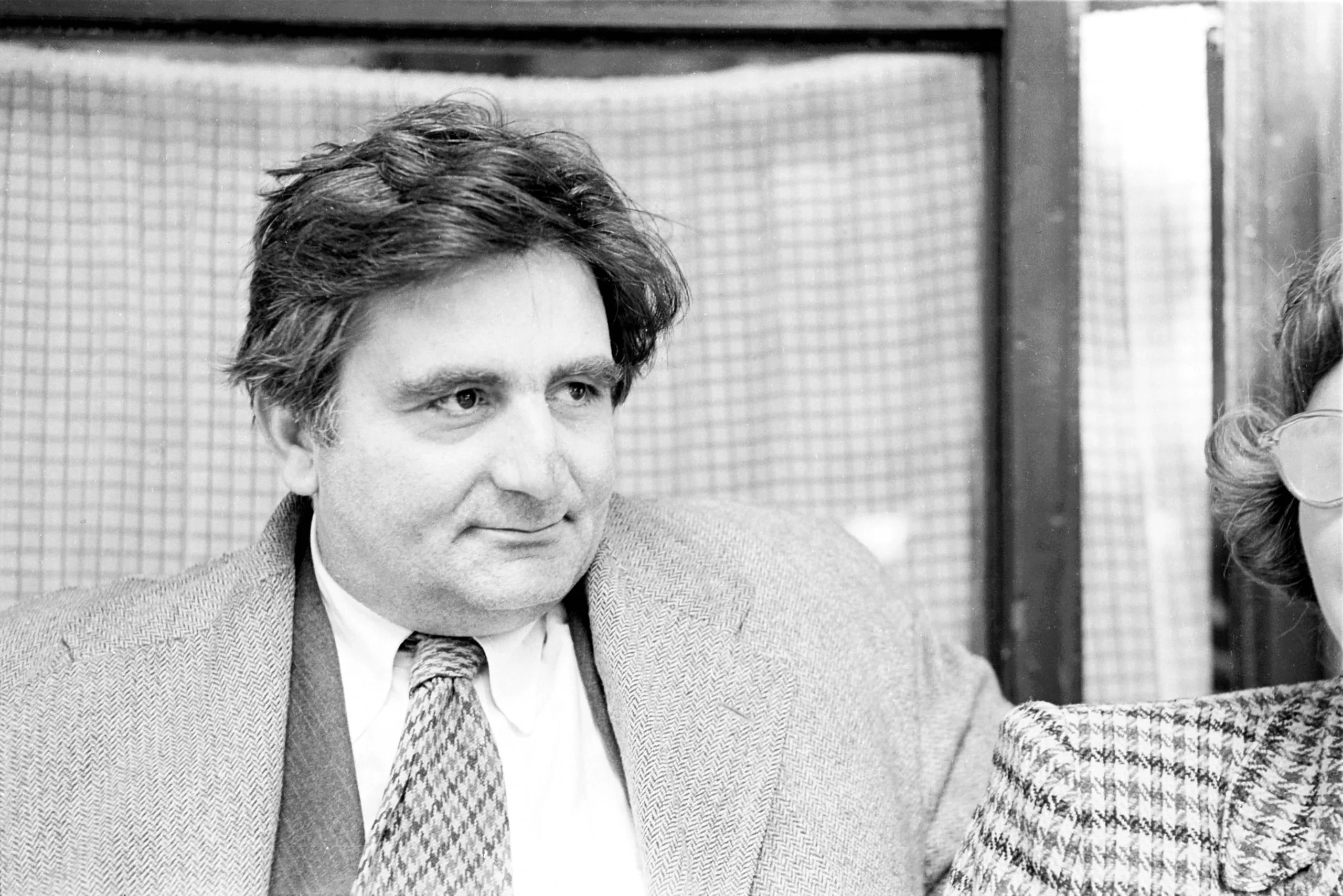 Black and white photograph, chest-up portrait of a man with dark tousled hair in a herringbone tweed jacket and patterned tie, turned slightly left, soft diffused lighting