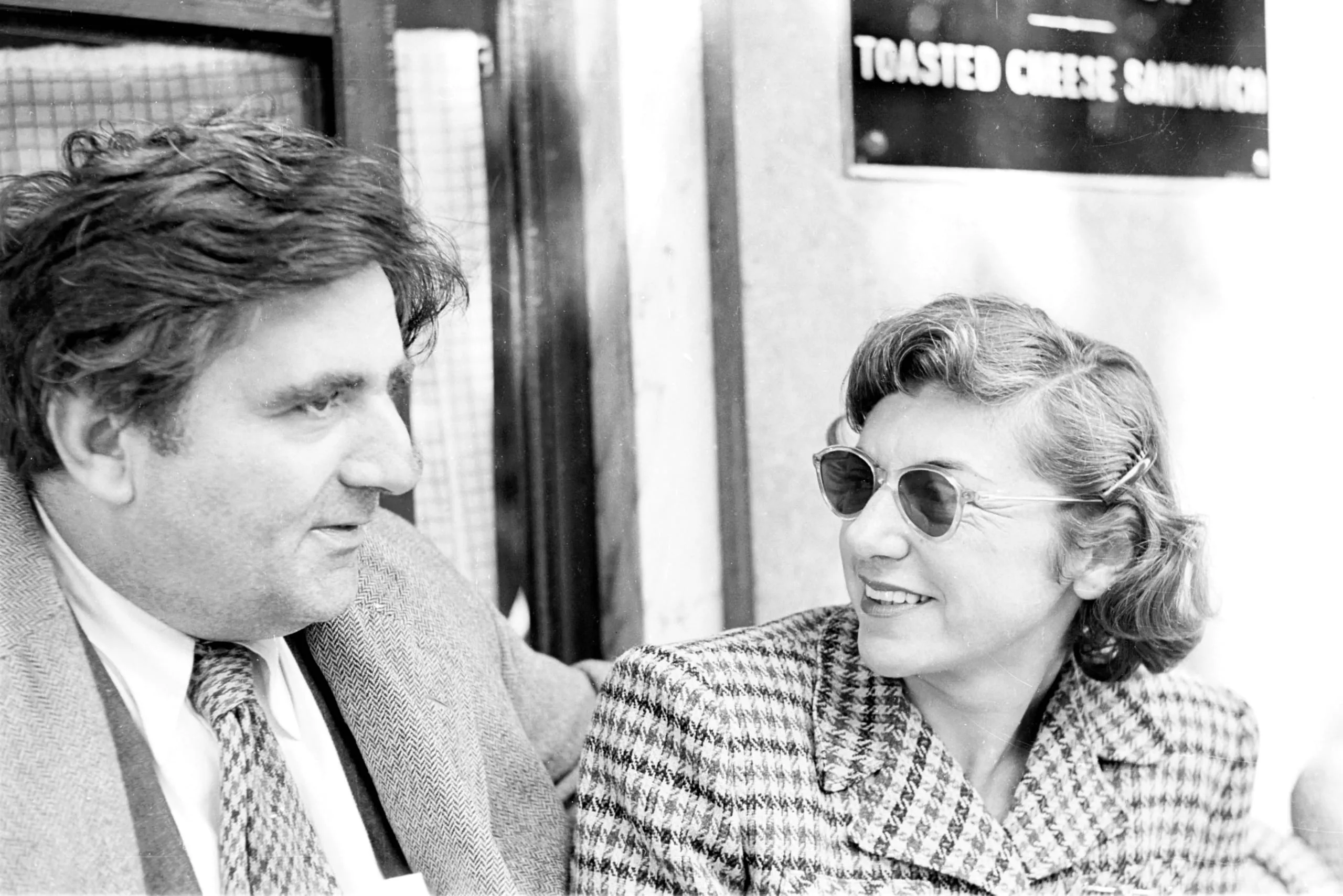 Black and white photograph of a man and woman seated outdoors, both in patterned coats, a partial storefront sign reading "TOASTED CHEESE SANDWIC" visible behind them