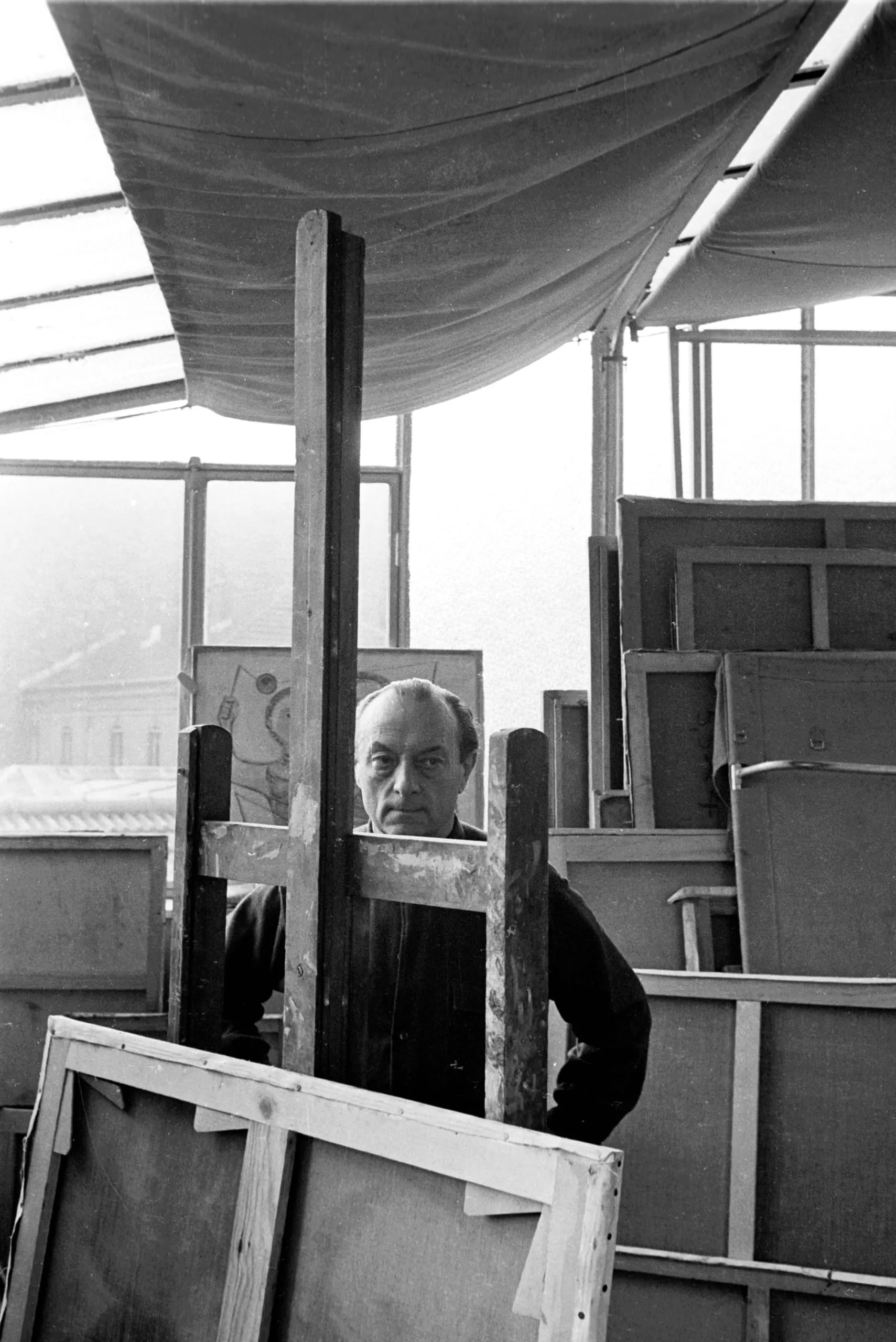 Black and white photograph, a man's face framed between a vertical canvas stretcher bar and stacked paintings in a skylit artist's studio