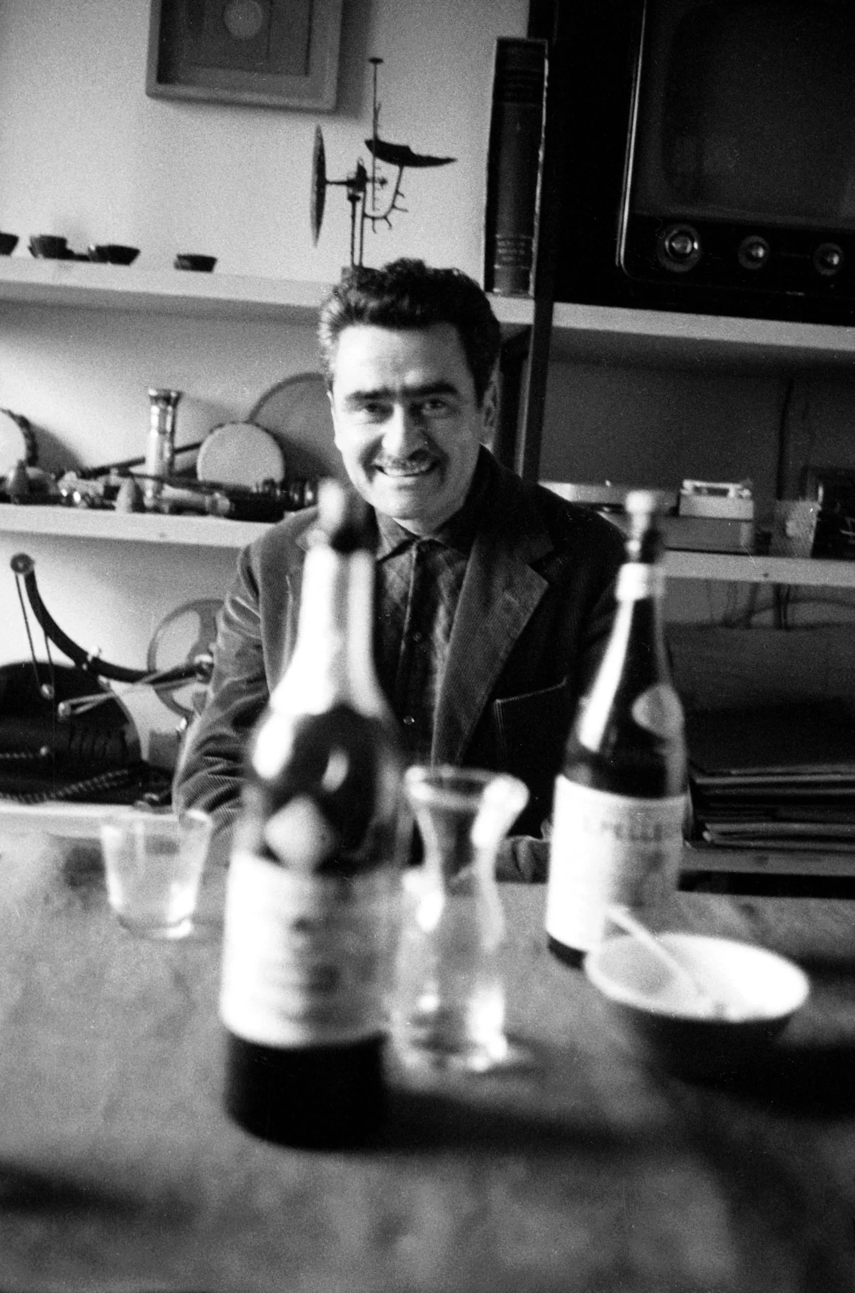 Black and white photograph of a smiling, dark-haired man seated at a table with bottles and a glass in the foreground, shelves and a hanging mobile behind him
