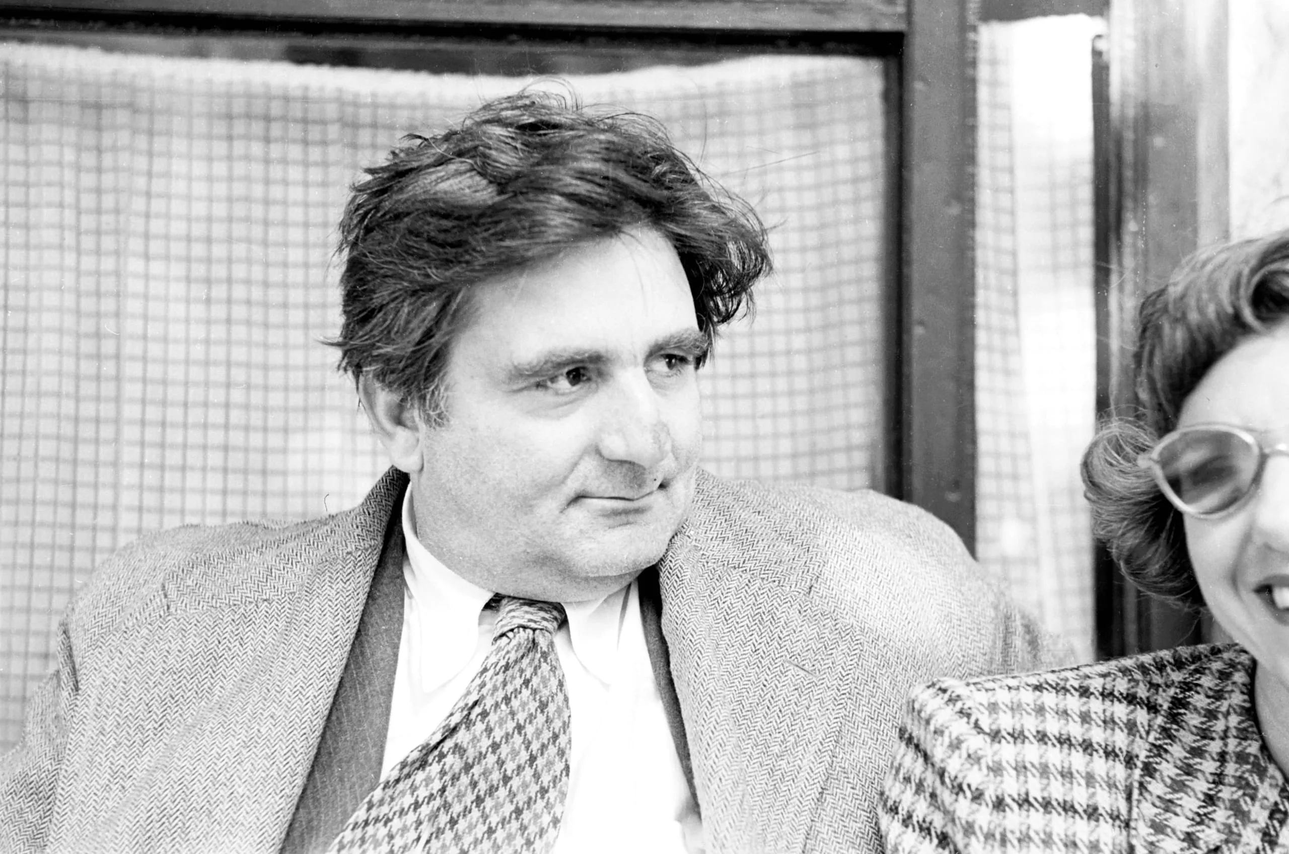 Black and white photograph, a white man with thick dark wavy hair in a tweed jacket and patterned tie, head turned to the right, with a partially cropped woman in houndstooth at the right edge