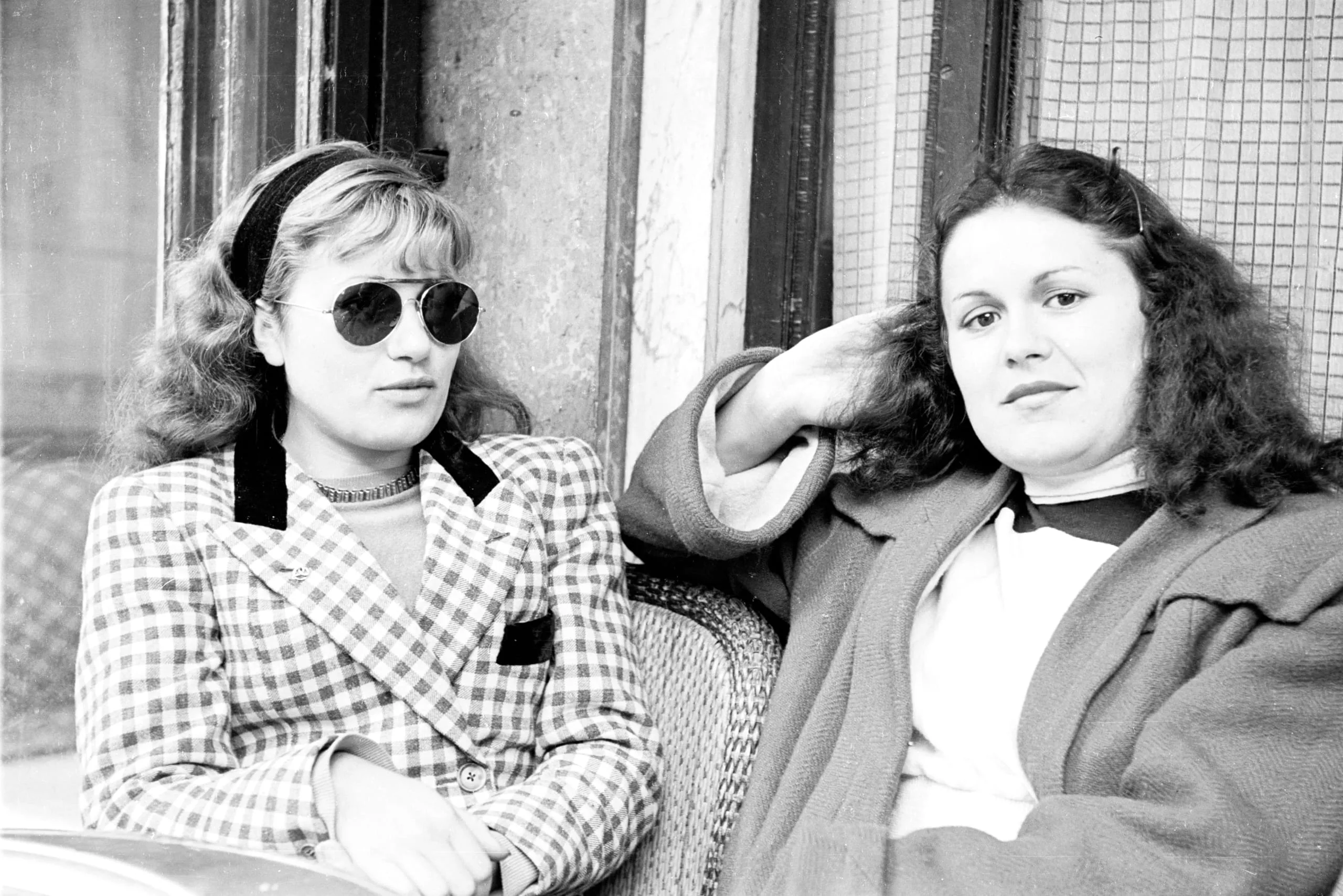 Black and white photograph of two young women seated outdoors, one in a plaid blazer and aviator sunglasses, the other in a cardigan looking directly at the camera