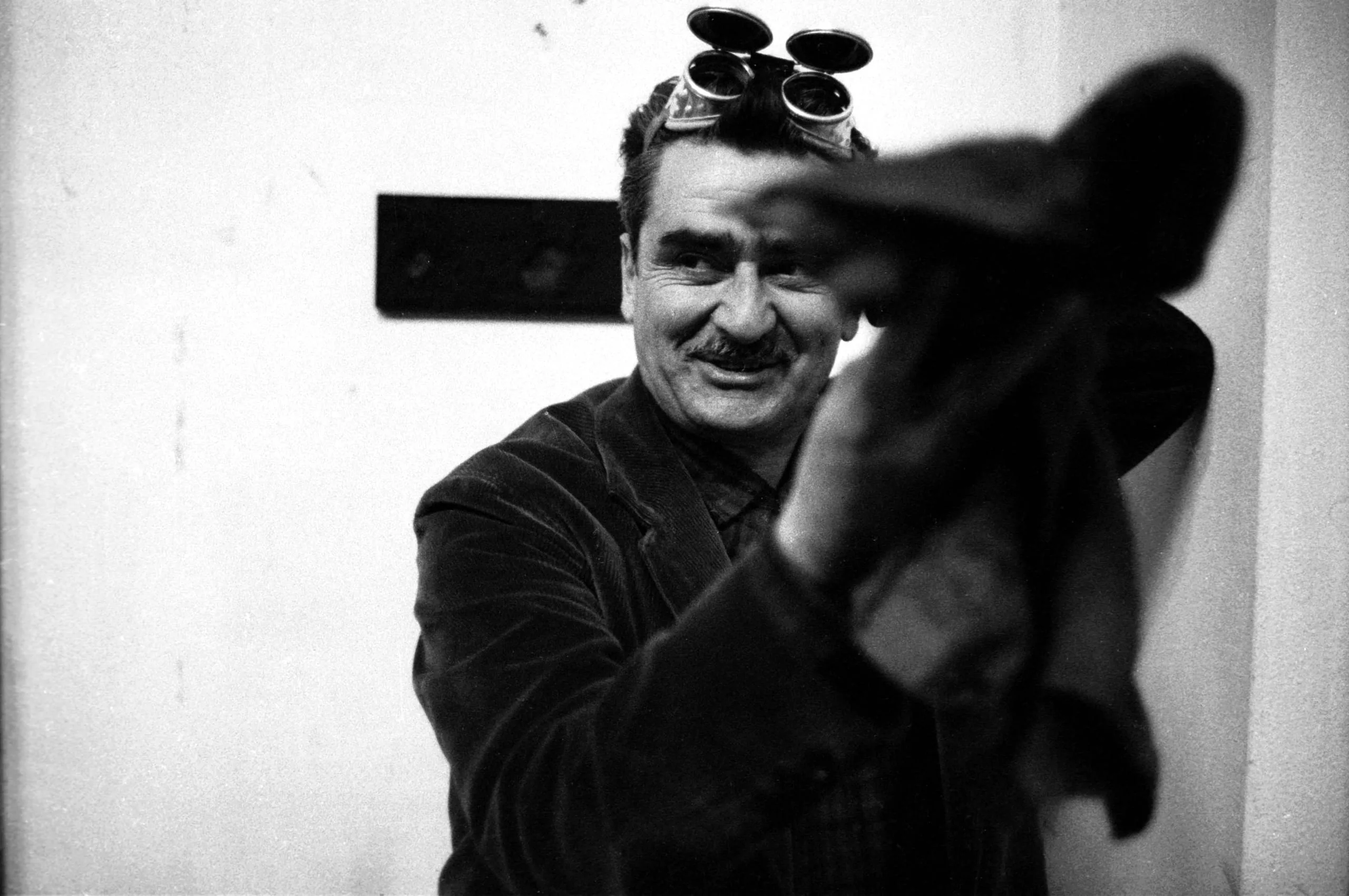 Black and white photograph of a smiling man in a work jacket, industrial goggles pushed up on his forehead, reaching toward the camera with a blurred dark object in the foreground