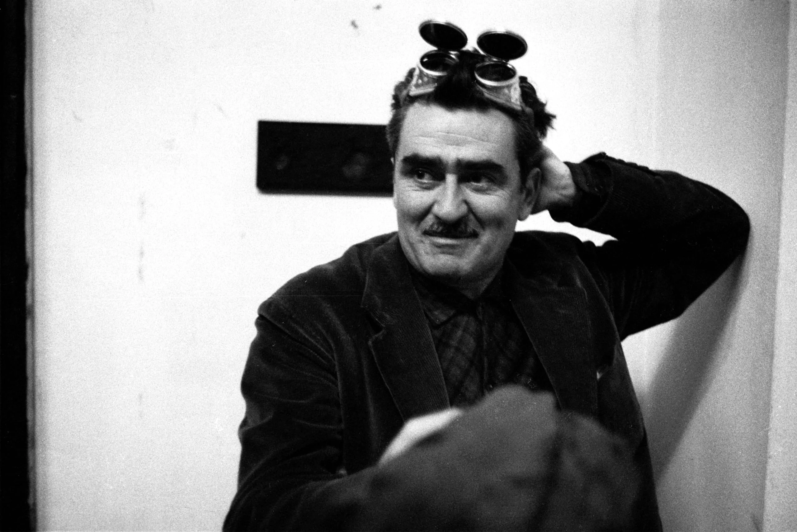 Black and white photograph of a white man leaning against a wall, wearing a blazer and flip-up goggles pushed to the top of his head, right hand raised behind his head