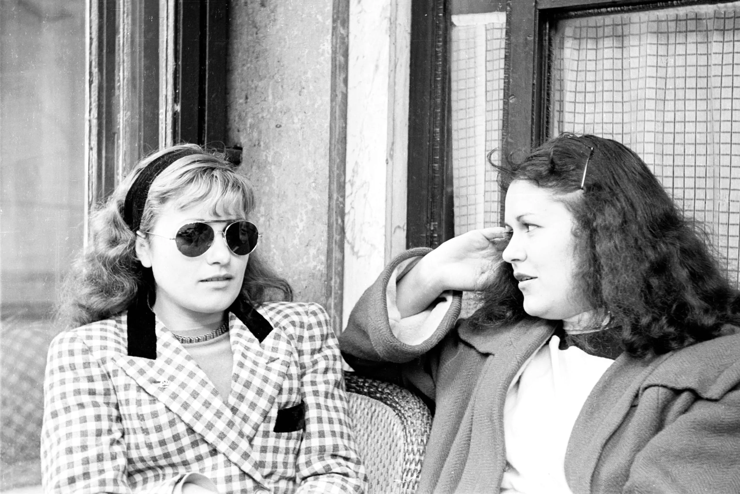 Black and white photograph of two young women seated outdoors, one in aviator sunglasses and gingham blazer, the other in a draped cardigan, facing each other in conversation