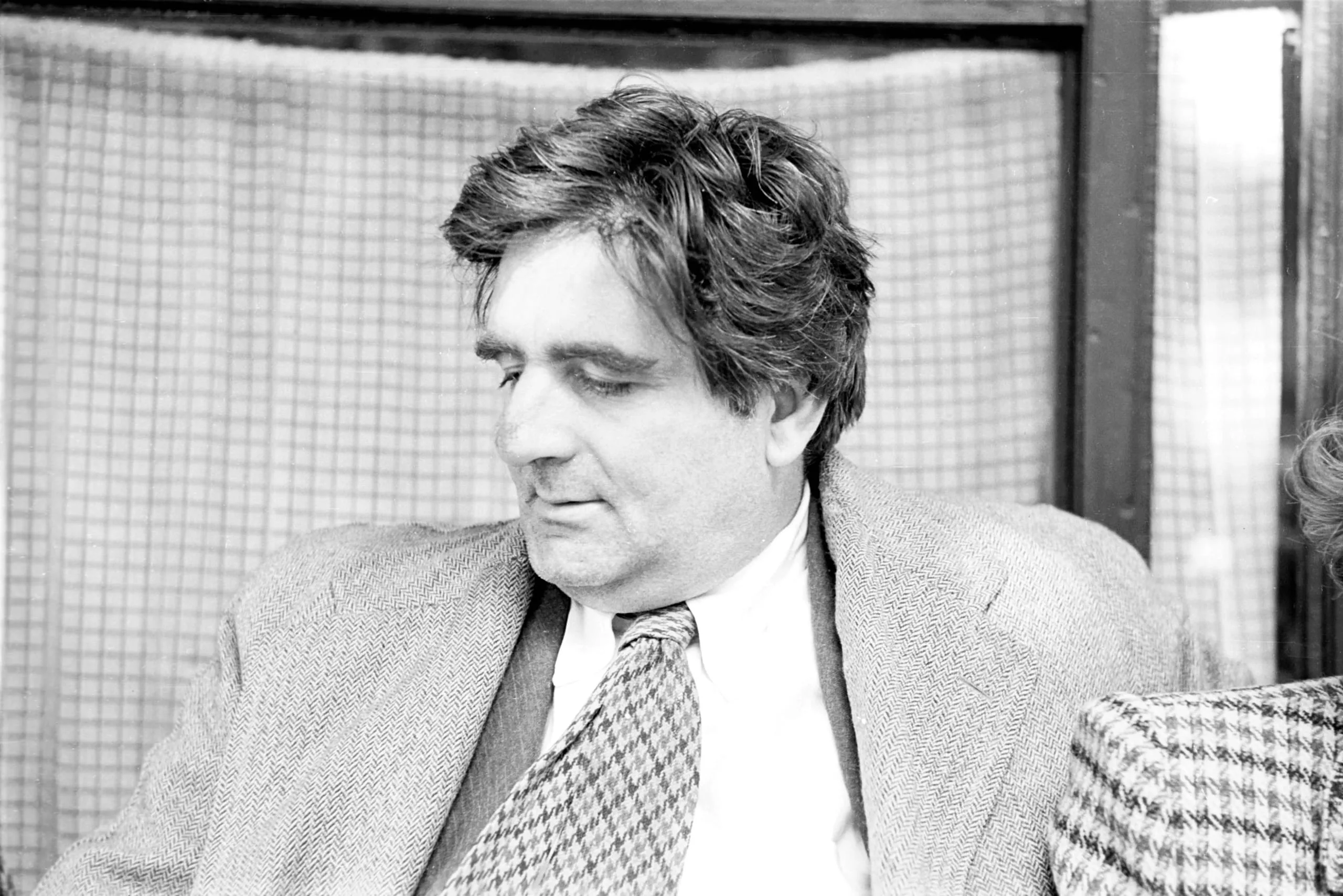 Black and white portrait photograph, man from the chest up with wavy dark hair, head tilted downward, wearing a textured sport coat and patterned tie