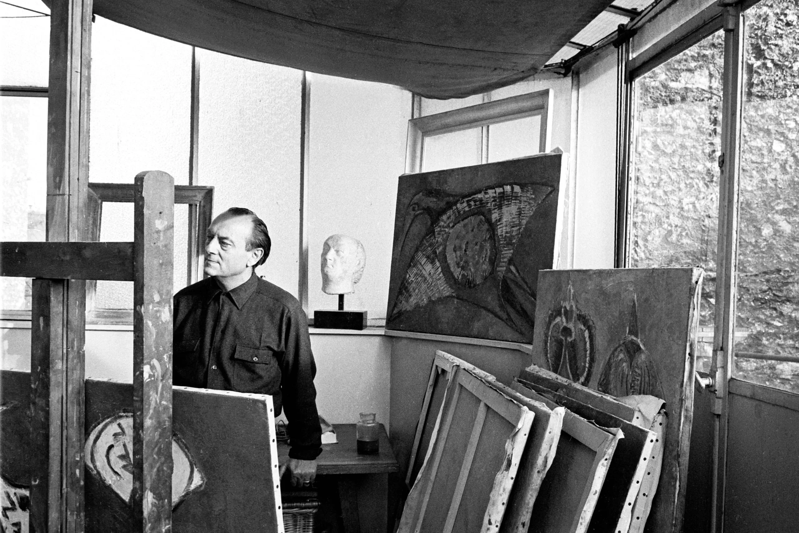 Black and white photograph of a man in a dark shirt standing in an artist's studio surrounded by large abstract paintings and a small sculptural head