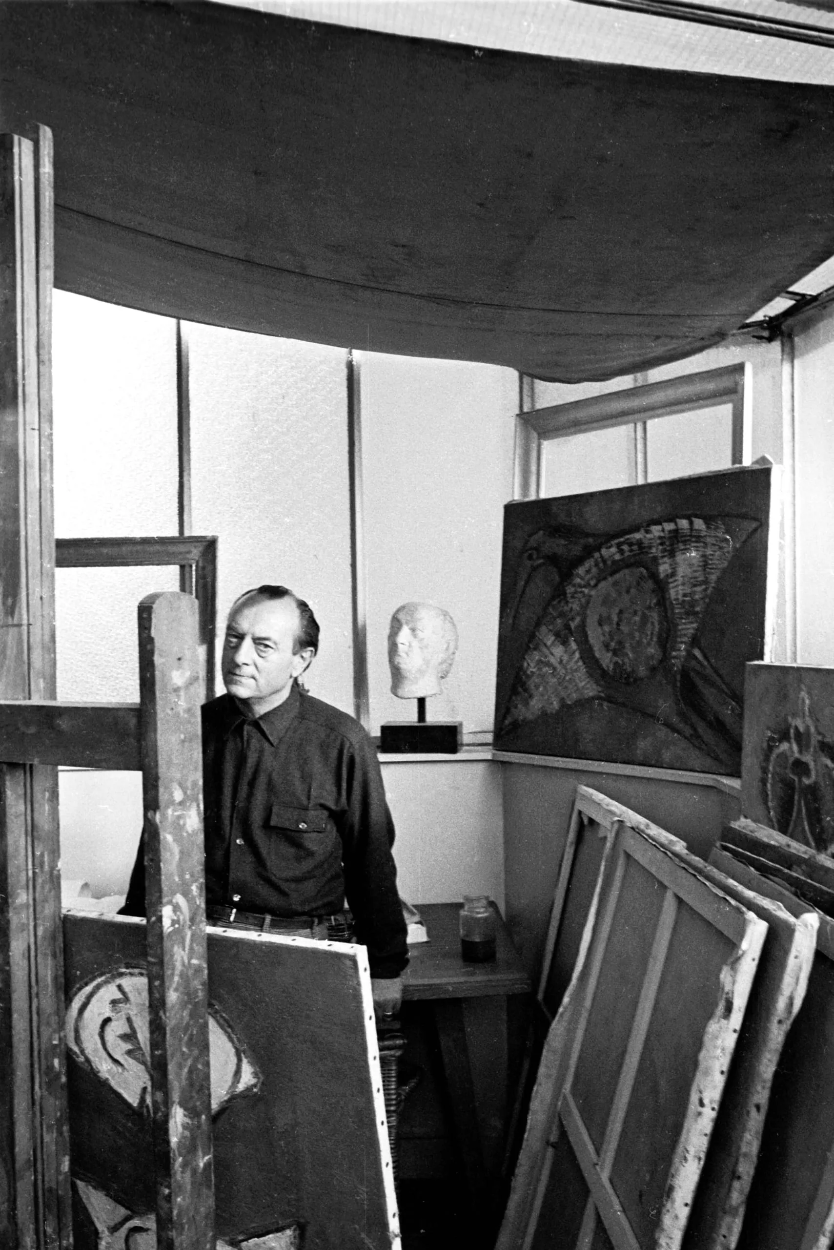 Black and white photograph of a man in a dark shirt standing among paintings and easels in an artist's studio, with a sculptural bust visible behind him