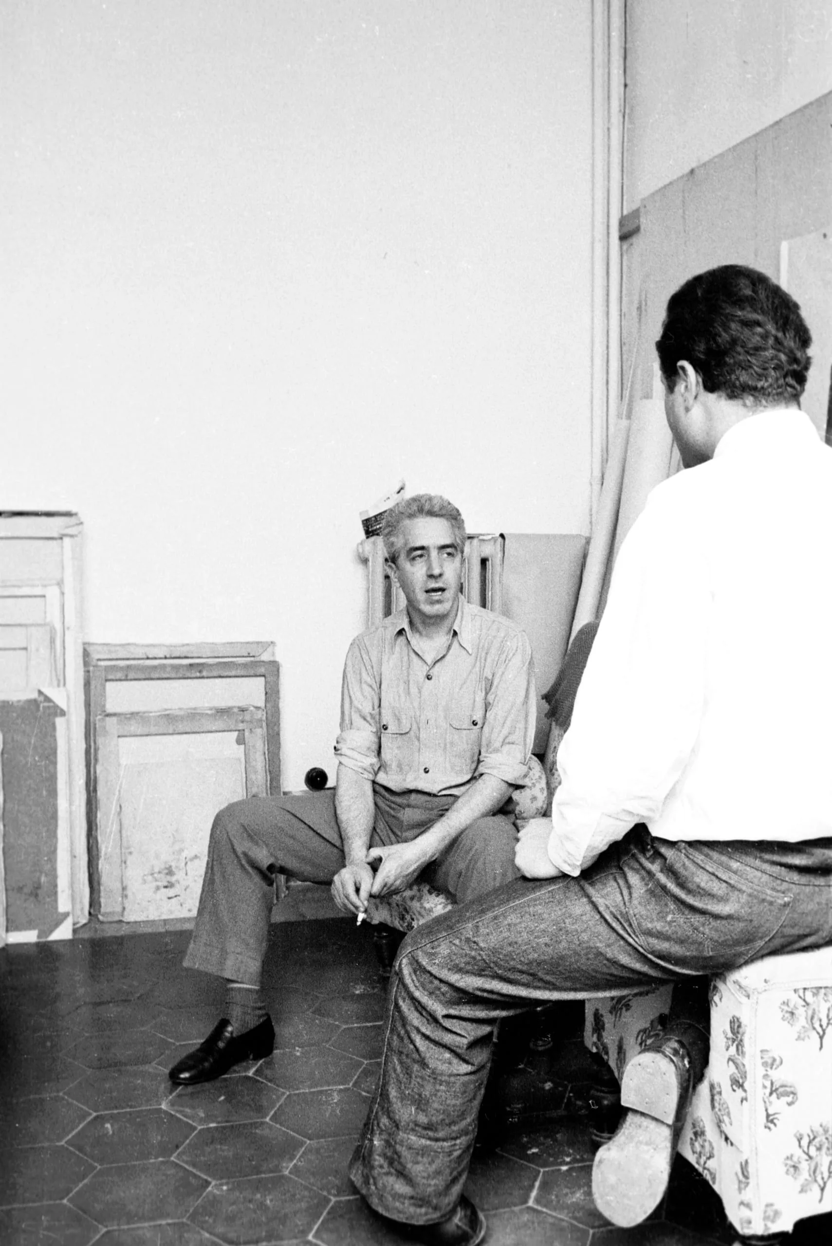 Black and white photograph of two men seated facing each other in an artist's studio, canvas frames leaning against the wall behind them, hexagonal tile floor