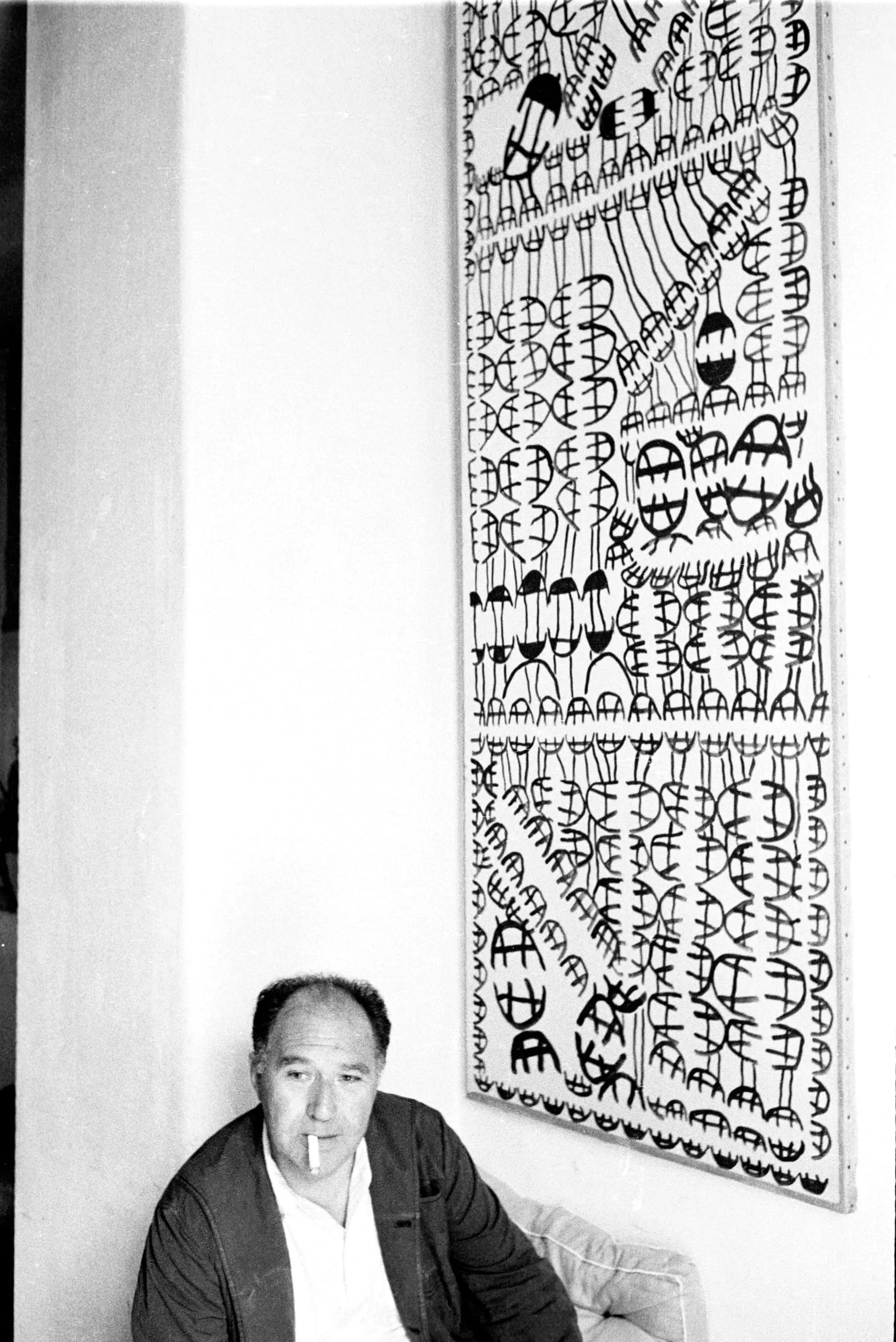 Black and white photograph of a man seated beneath a large two-panel painting densely covered in repeating abstract black marks on a light background