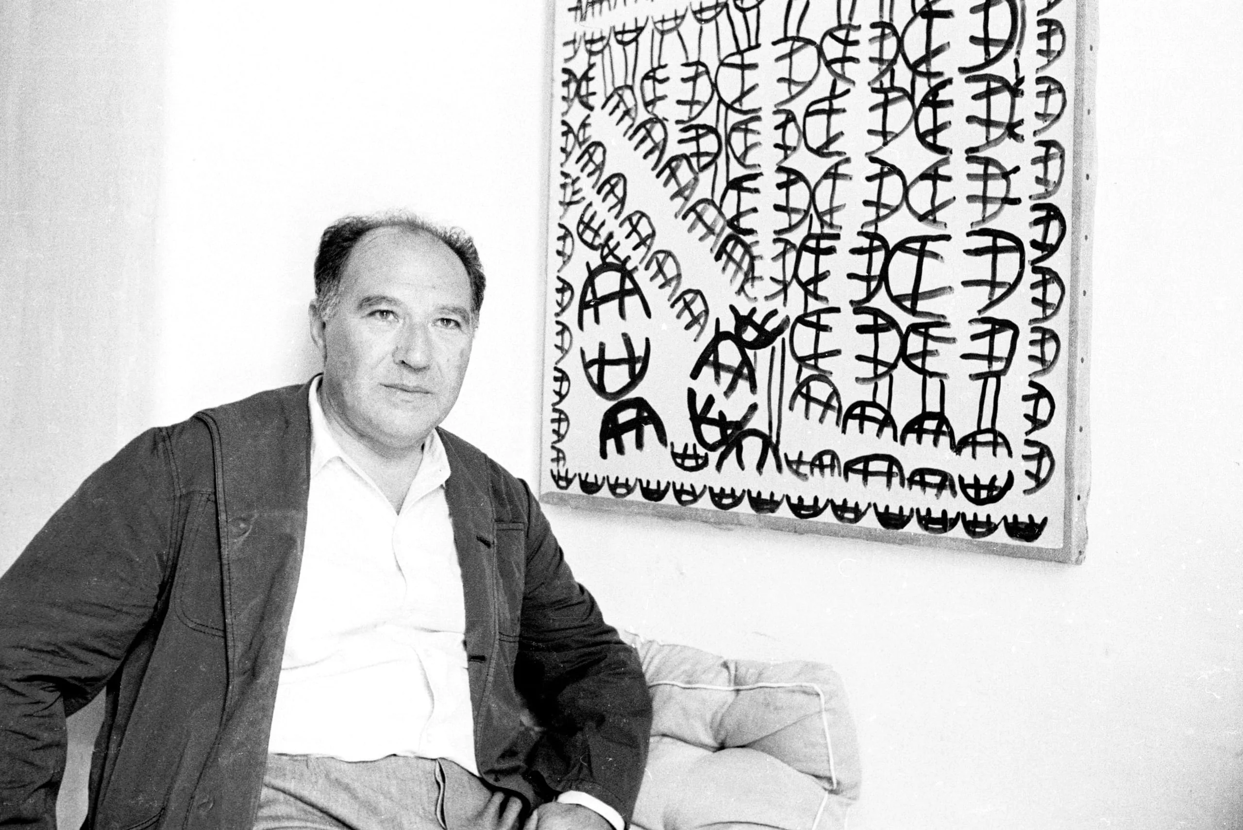 Black and white photograph of a seated white man in a blazer, angled toward the camera, with a large abstract painting of repeated black gestural marks on a white ground visible on the wall behind him