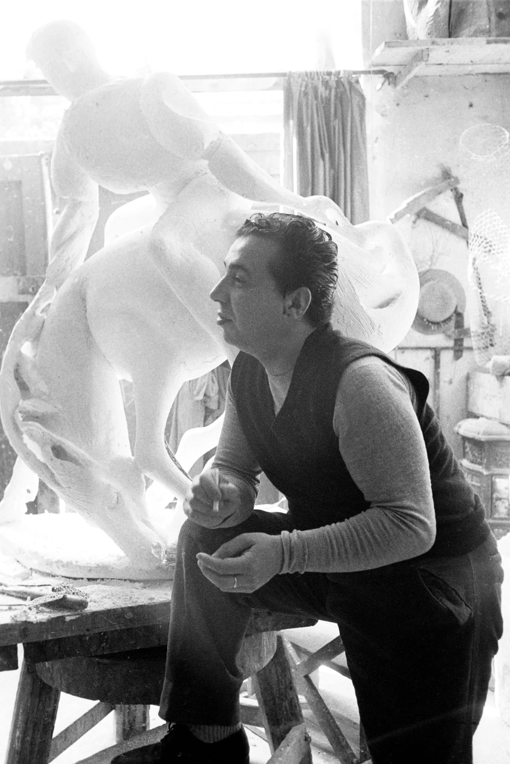 Black and white photograph of a dark-haired man in a vest seated on a studio sawhorse in profile, with a large white plaster sculpture behind him