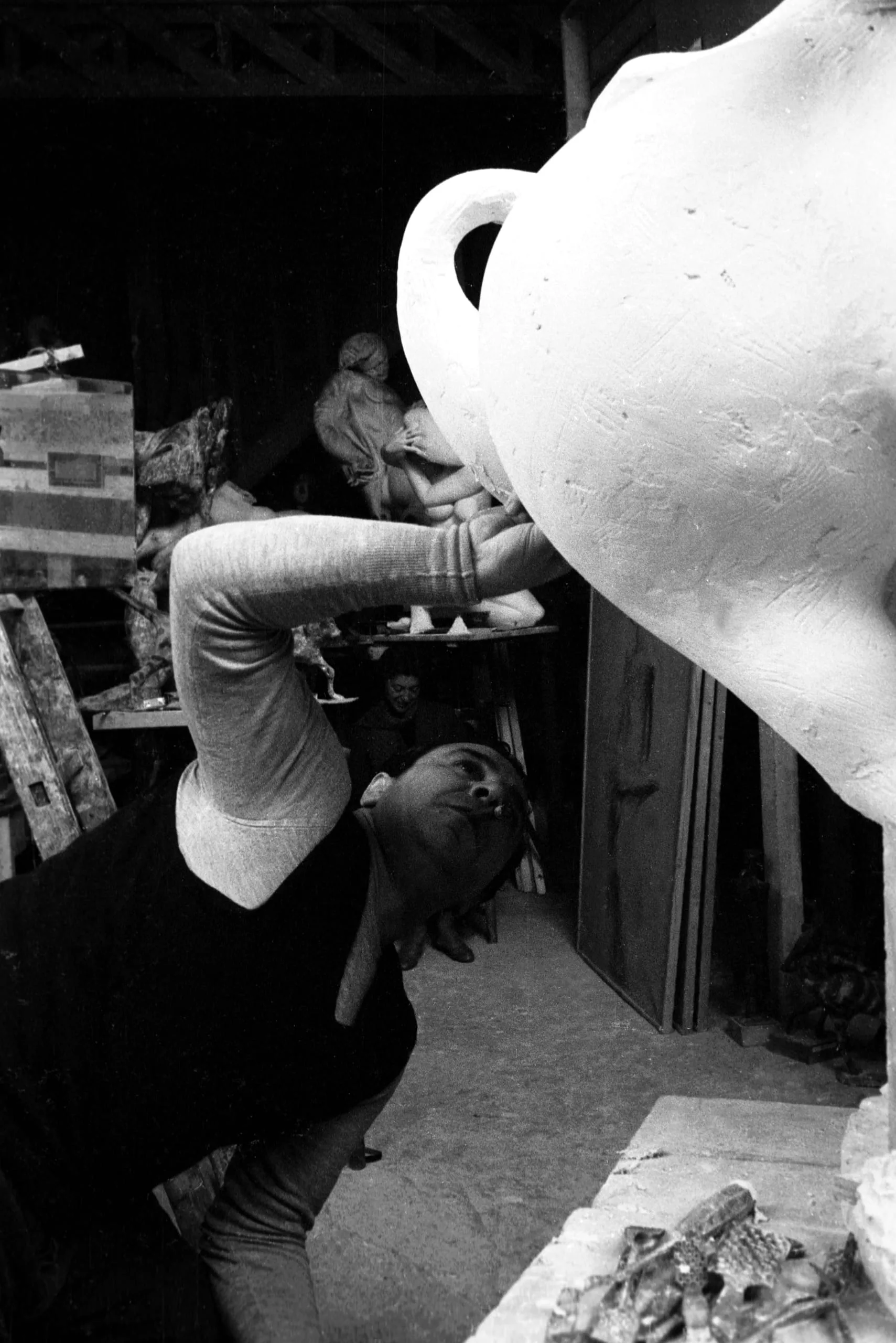 Black and white photograph of a person in a studio tilting their head back to examine the underside of a large white plaster or clay vessel, with smaller sculptures and wooden crates visible in the background