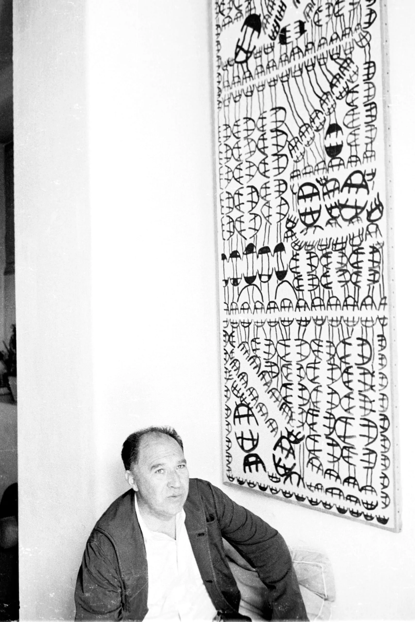 Black and white photograph of a seated man in a dark jacket beside a large two-panel painting covered in dense, gestural black marks on white