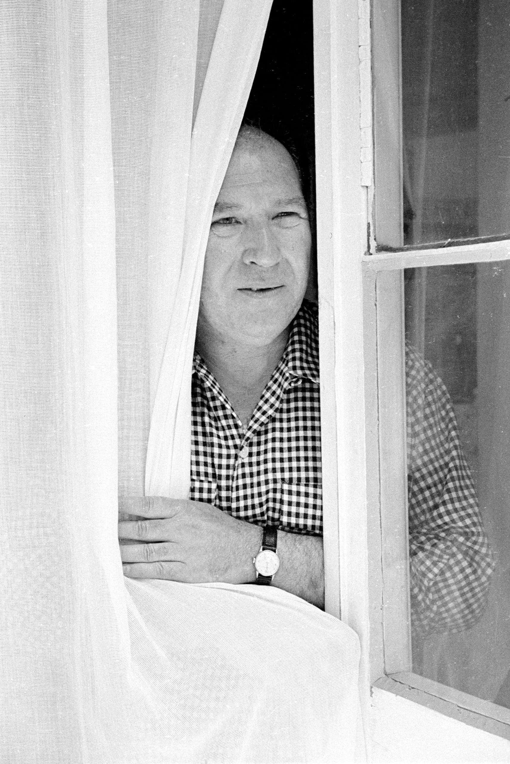 Black and white photograph of a man in a checked shirt leaning out of an open window, arms resting on the sill, looking toward the camera