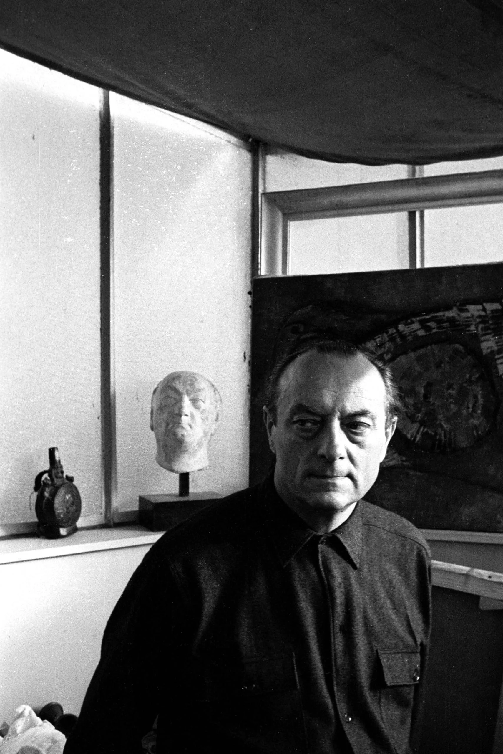 Black and white photograph, chest-up portrait of a middle-aged white man in a dark shirt seated in a studio, with a plaster bust and large painting visible behind him