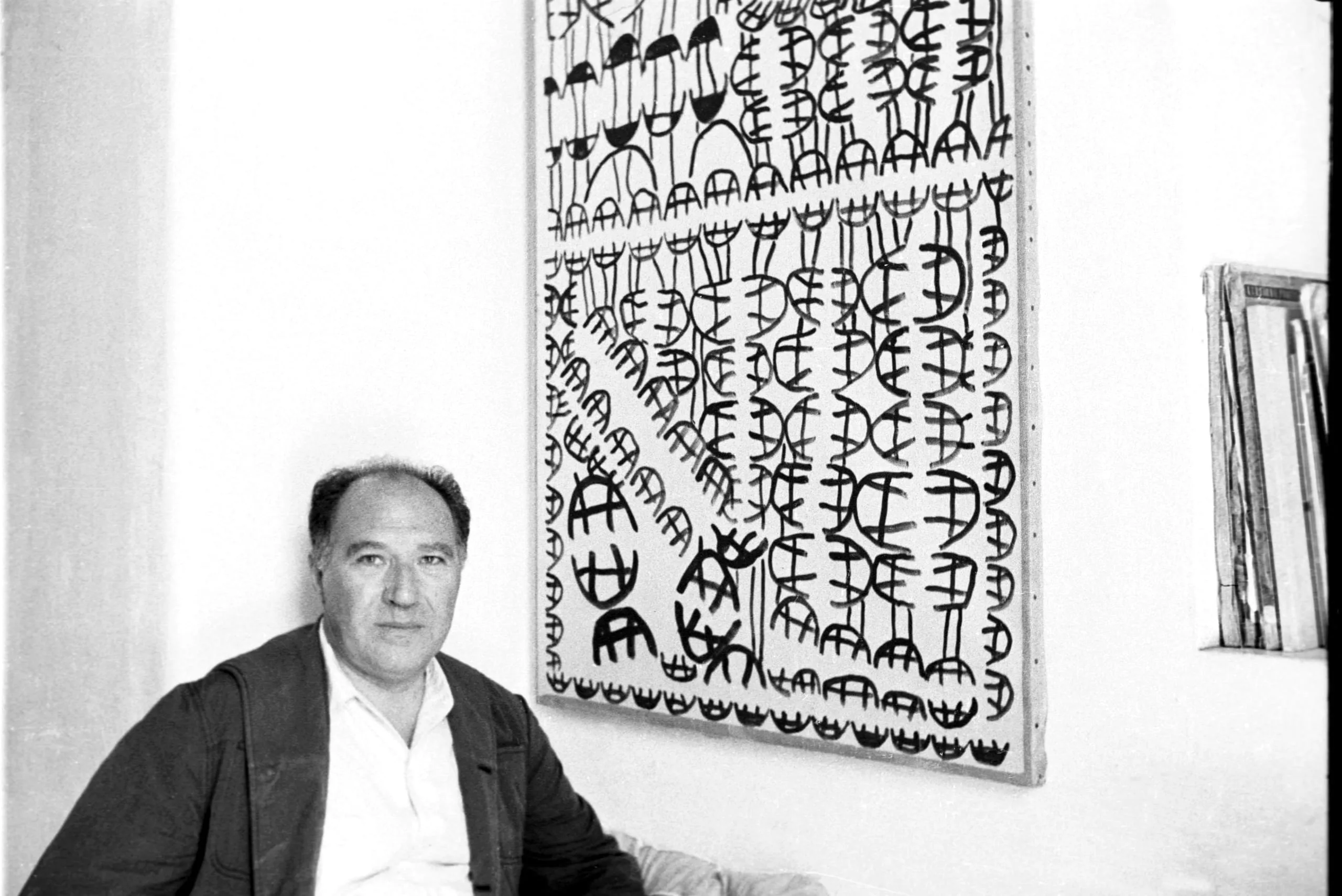 Black and white photograph of a dark-haired man in a blazer seated beside a large canvas covered in dense, symbol-like black figures