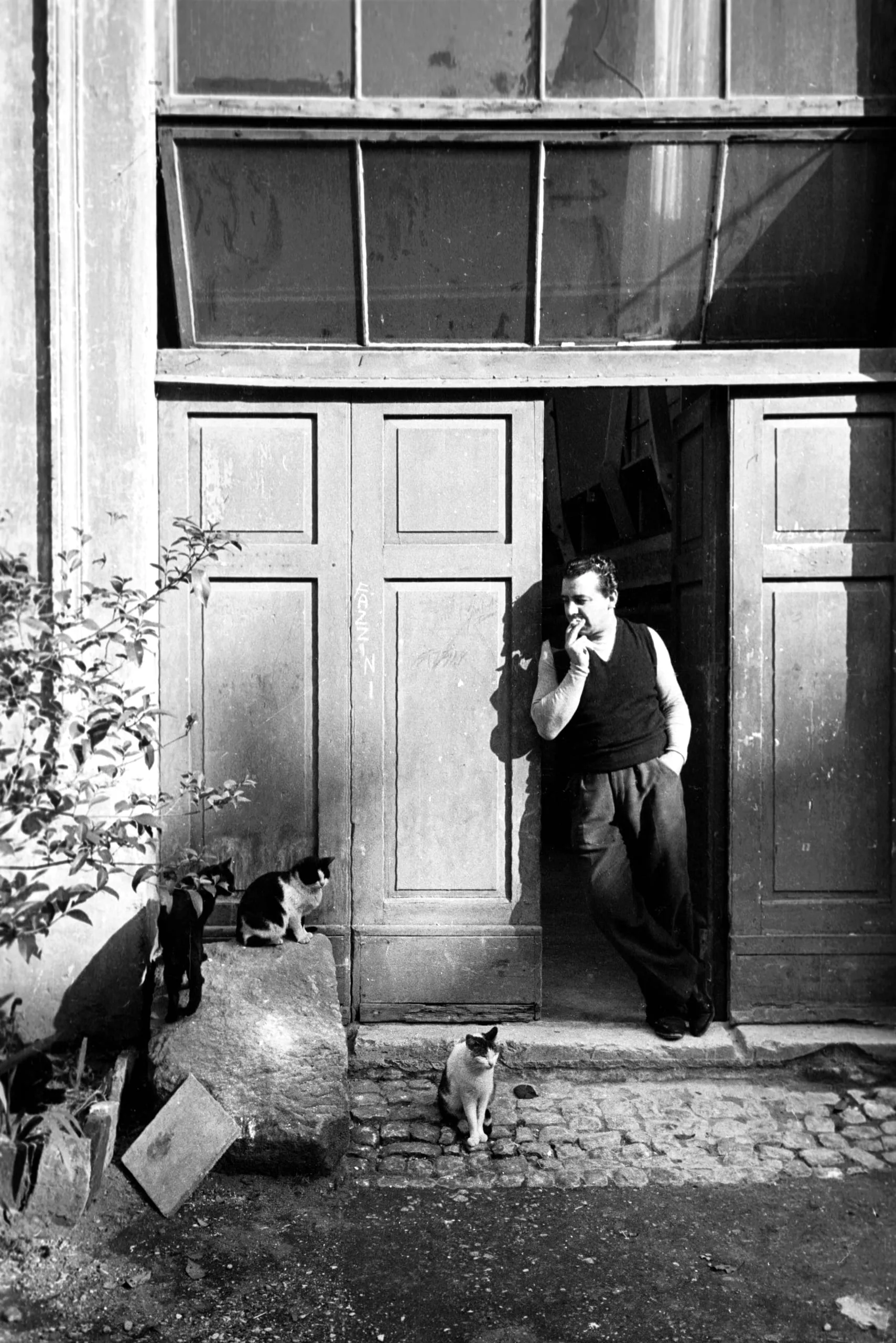 Black and white photograph of a heavyset man leaning in an open wooden doorway, looking to one side, with two black-and-white cats on cobblestones nearby