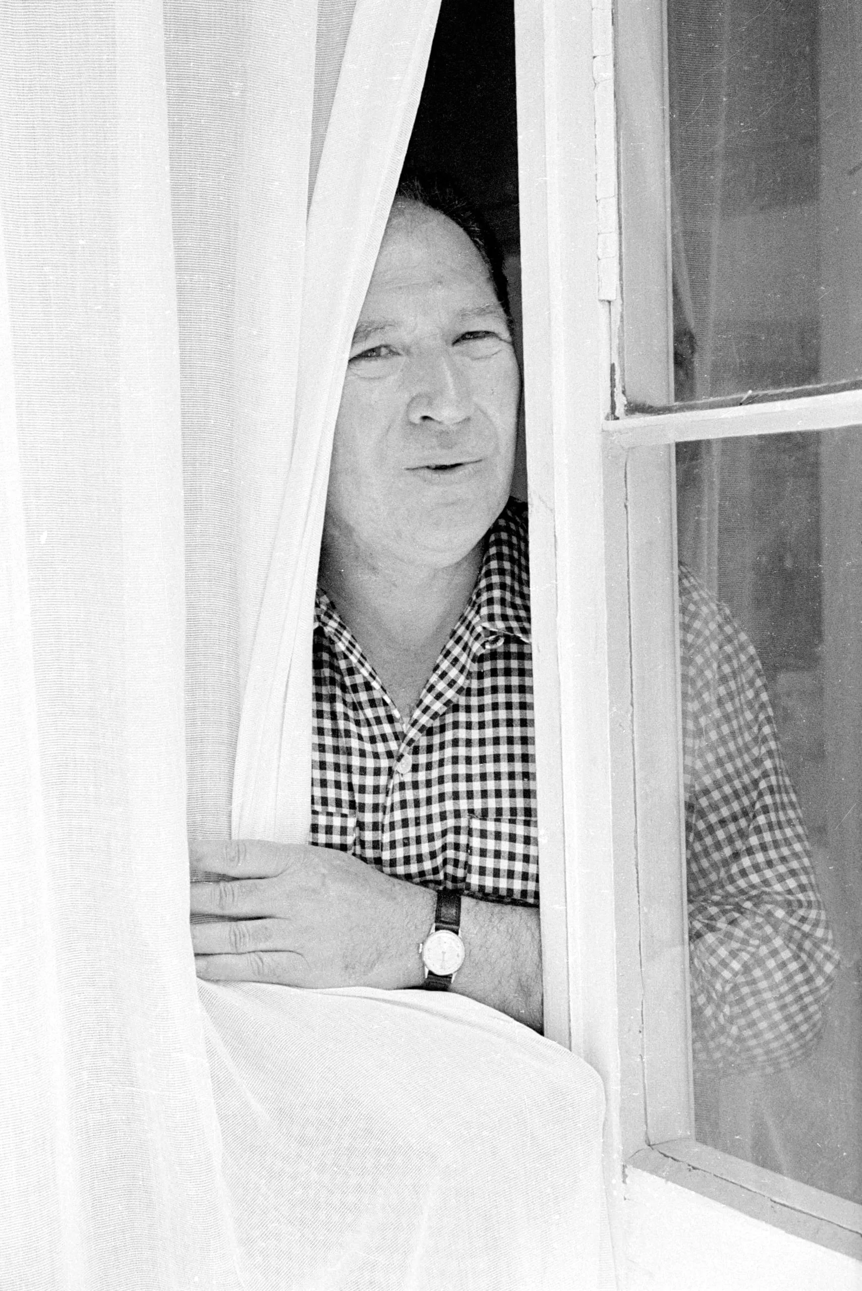 Black and white photograph of a white man in a gingham shirt leaning on a window sill, peering through a gap in white curtains