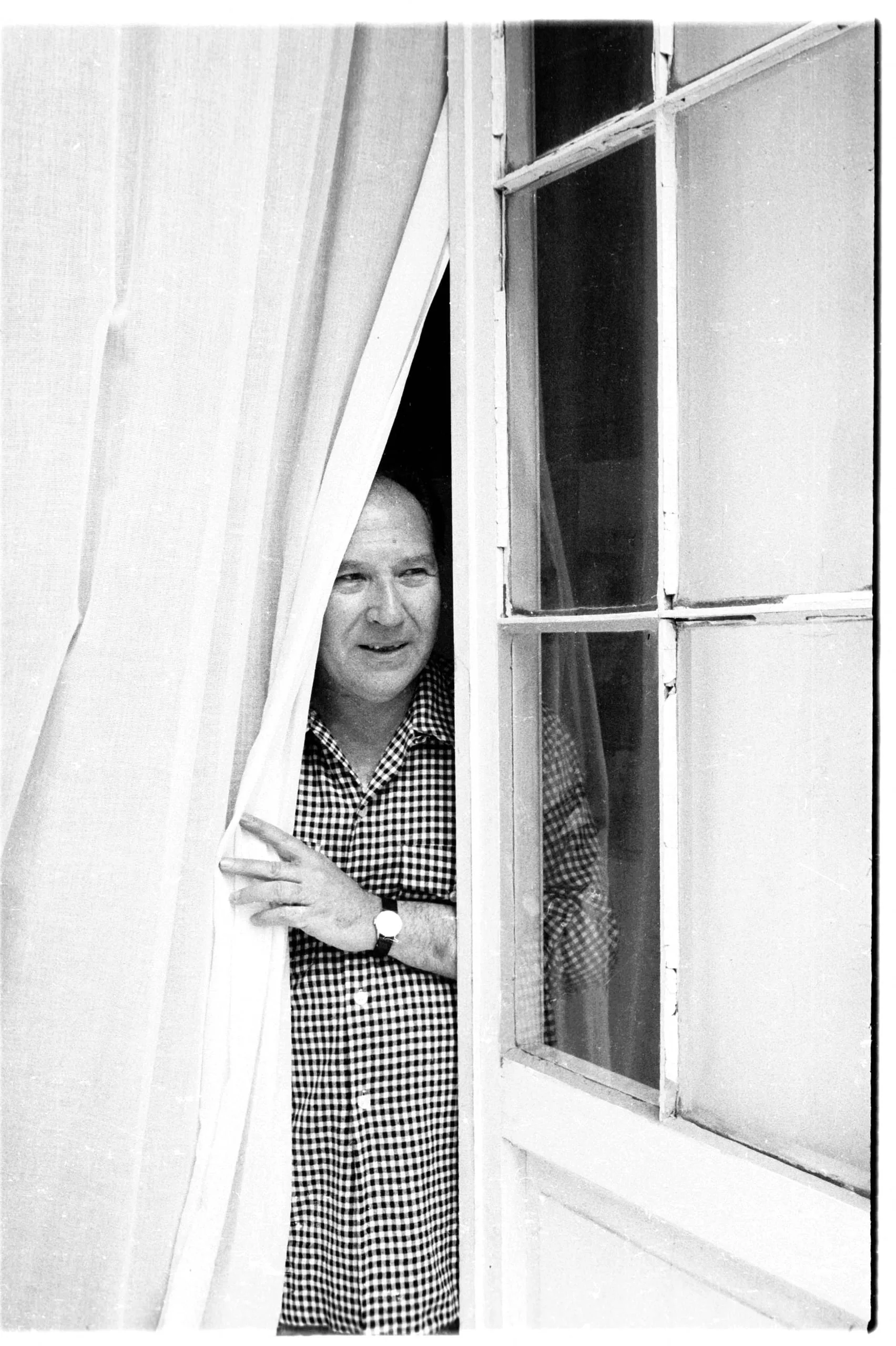 Black and white photograph of a man in a gingham shirt peering around a large white curtain beside a multi-paned window