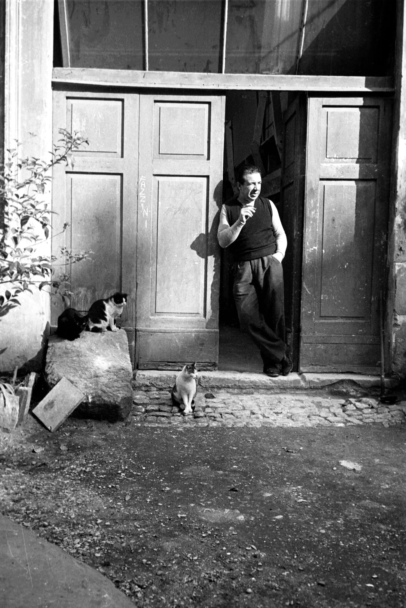 Black and white photograph of a white man in a sleeveless undershirt shouting from an open doorway, with two cats nearby on cobblestones