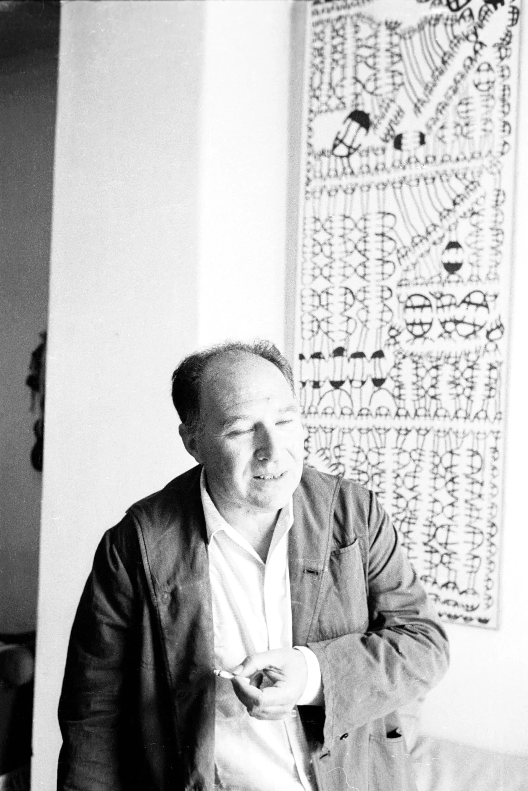 Black and white photograph of a middle-aged man in a dark blazer and open-collar shirt, standing before a wall-hung drawing covered in dense black linear symbols