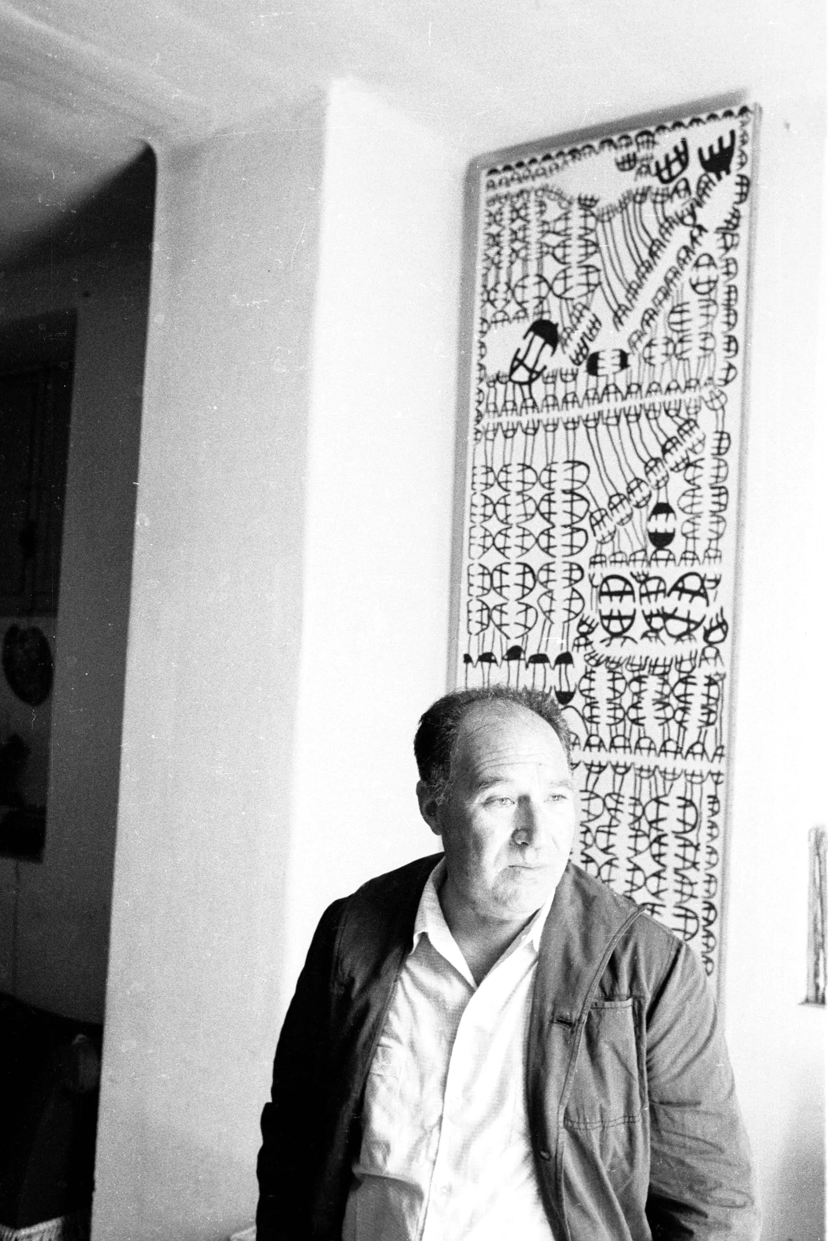 Black and white photograph, a white man in a blazer and collared shirt looks to the left, standing before a wall-mounted textile covered in dense black linear markings