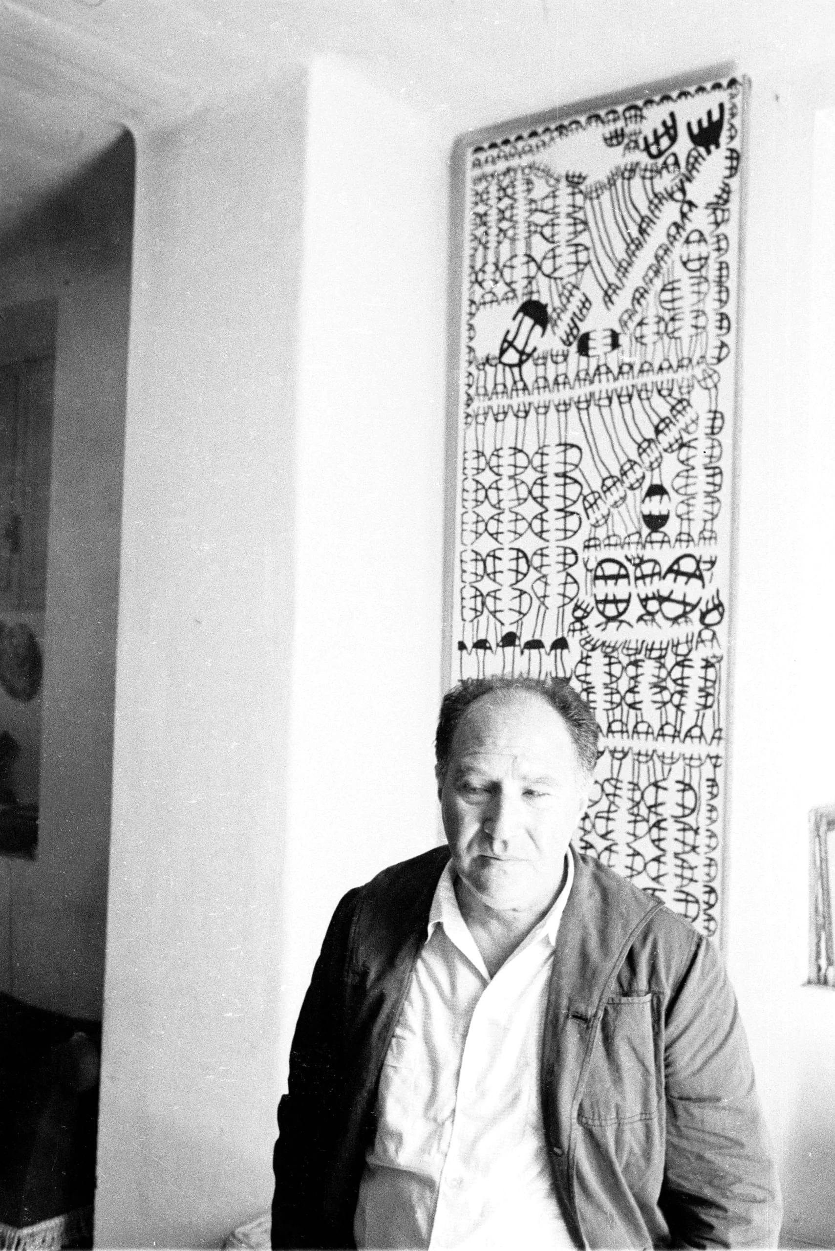 Black and white photograph, a man from the waist up standing before a white wall hung with a tall, narrow artwork densely covered in abstract dark markings