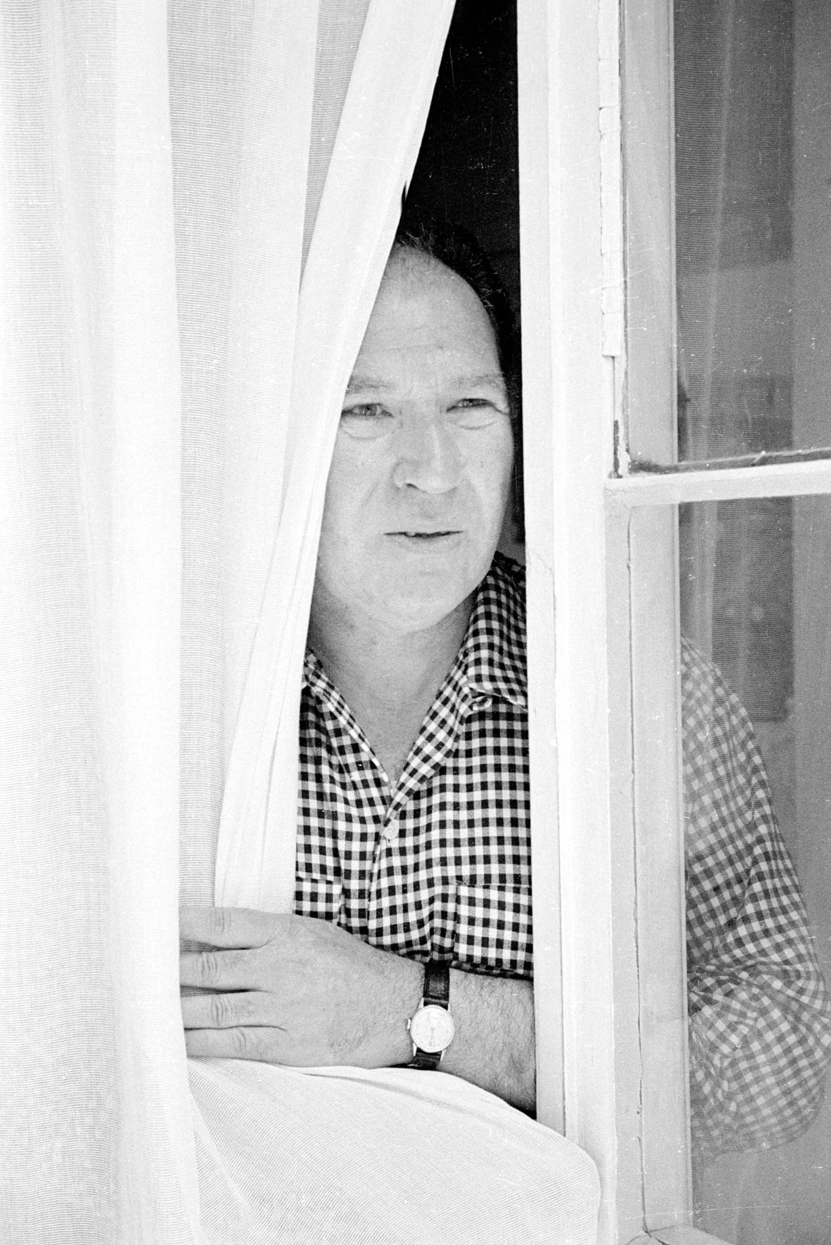 Black and white photograph of a man peering through parted white curtains at an open window, wearing a gingham shirt and wristwatch