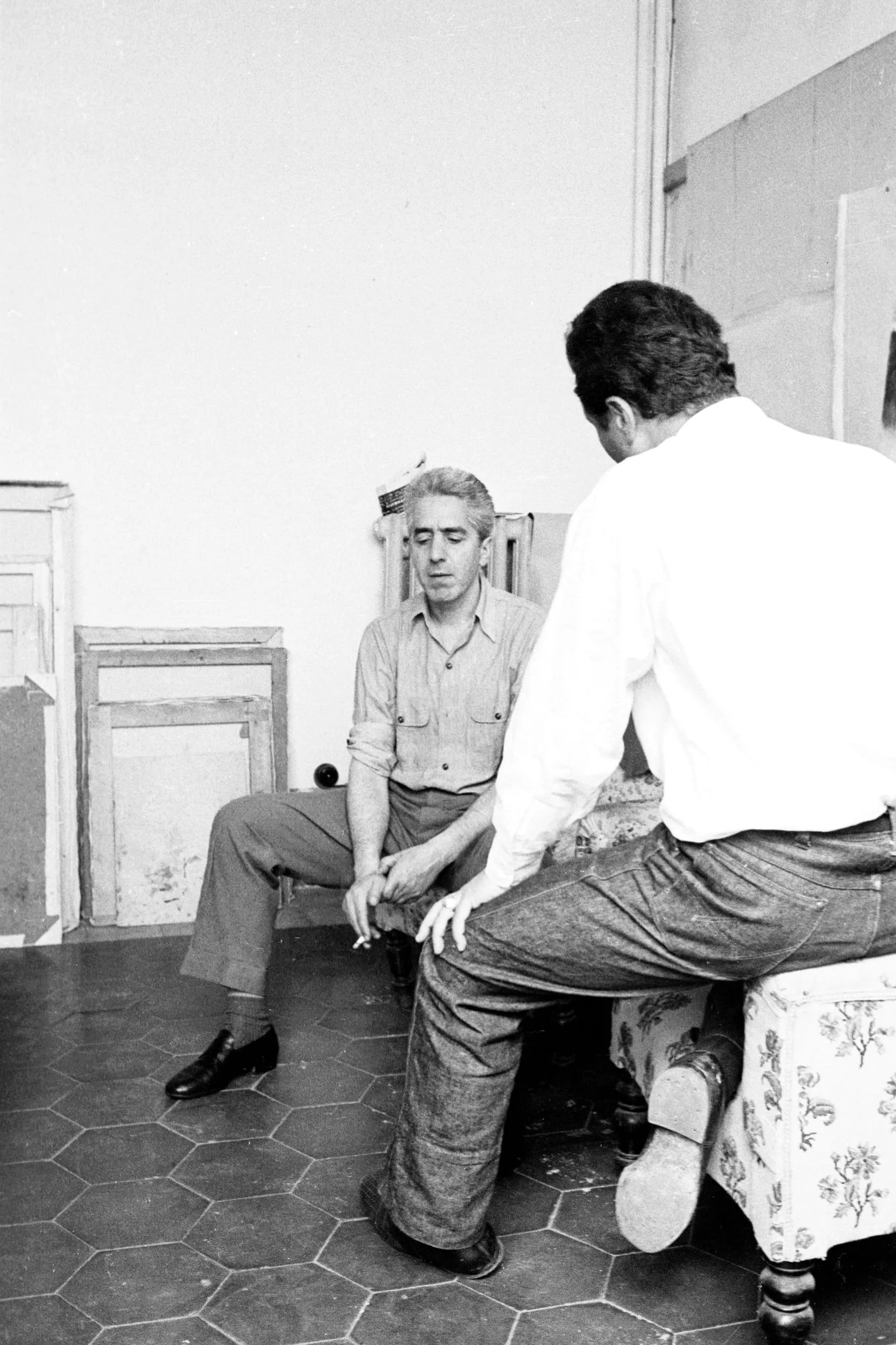 Black and white photograph of two men seated facing each other in a studio, one holding a cigarette, empty picture frames leaning against the wall behind them