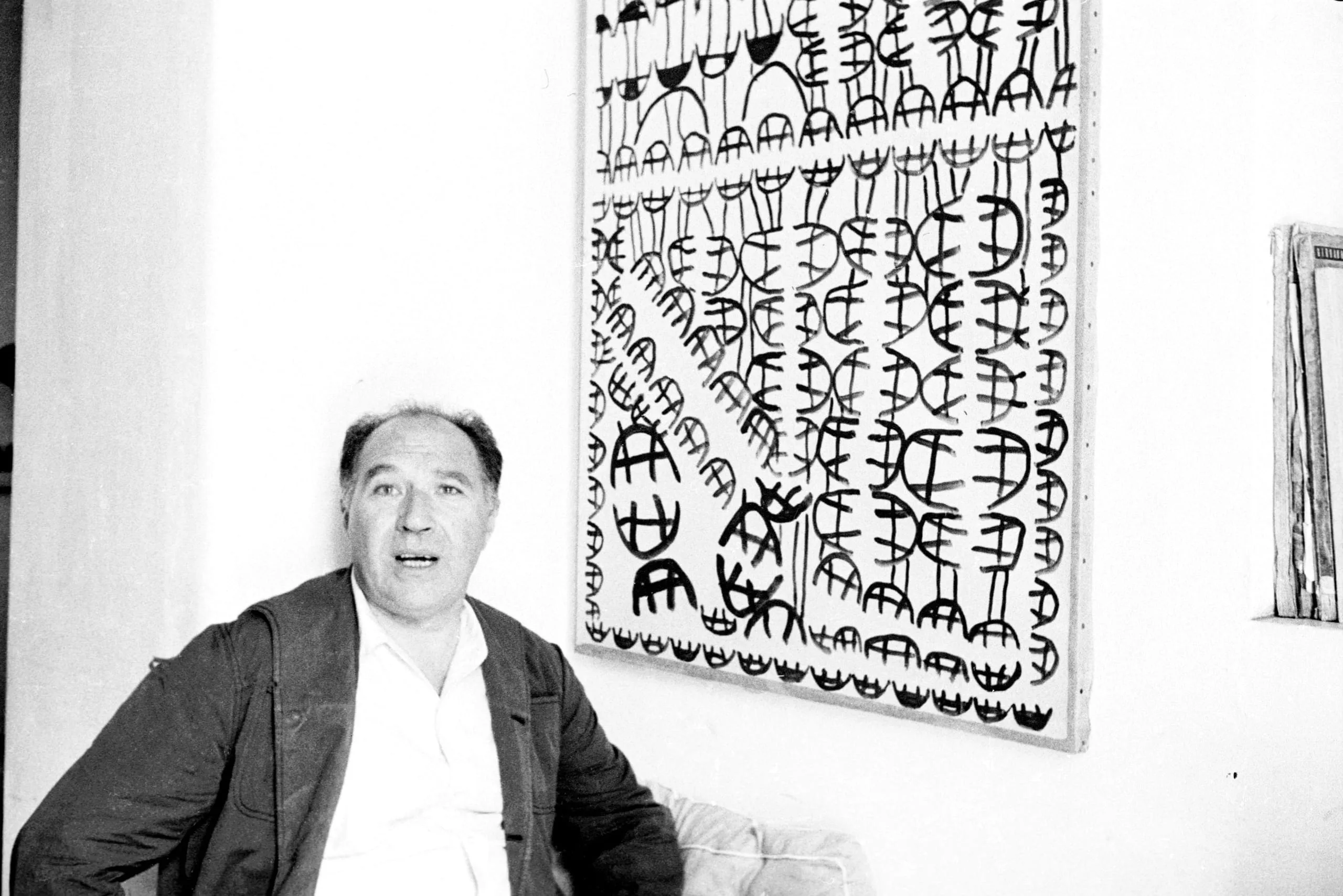 Black and white photograph of a man seated in front of a large painting densely covered with bold black abstract glyphs and figure-like marks on a white ground