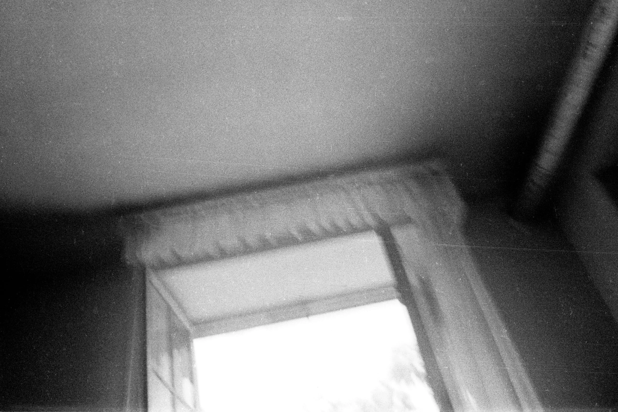 Black and white photograph, low-angle view looking up at a ceiling and curtained window, soft focus with visible film grain