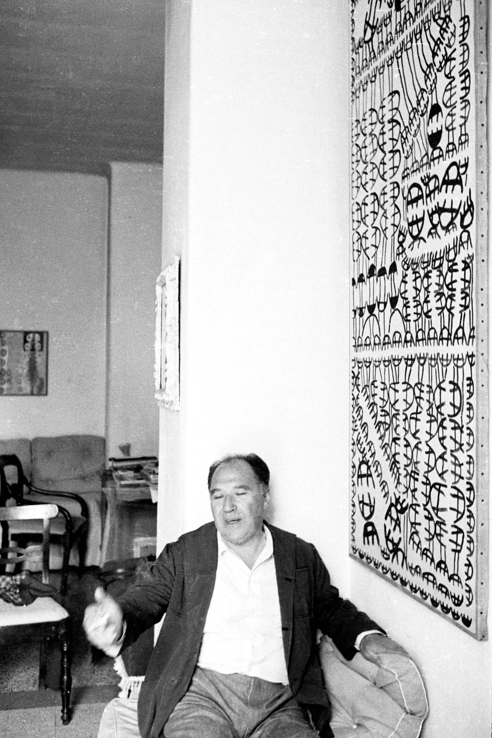 Black and white photograph of a middle-aged man seated against a white wall, gesturing with one hand, beside a large two-panel painting densely covered in bold black marks and pictographic forms
